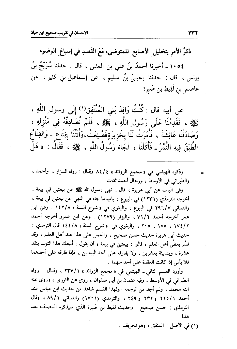 1054 - أَخْبَرَنَا أَحْمَدُ بْنُ عَلِيِّ بْنِ الْمُثَنَّى، قَالَ: حَدَّثَنَا سُرَيْجُ بْنُ يُونُسَ، قَالَ: حَدَّثَنَا يَحْيَى بْنُ سُلَيْمٍ، عَنْ إِسْمَاعِيلَ بْنِ كَثِيرٍ، عَنْ عَاصِمِ بْنِ لَقِيطِ بْنِ صَبِرَةَ عَنْ أَبِيهِ قَالَ: كُنْتُ وَافِدَ بَنِي الْمُنْتَفِقِ1 إِلَى رَسُولِ اللَّهِ، صَلَّى اللَّهُ عَلَيْهِ وَسَلَّمَ، فَقَدِمْنَا عَلَى رَسُولِ اللَّهِ، صَلَّى اللَّهُ عَلَيْهِ وَسَلَّمَ، فَلَمْ نُصَادِفْهُ فِي مَنْزِلِهِ، وَصَادَفْنَا عَائِشَةَ، فَأَمَرَتْ لَنَا بِخَزِيرَةٍ فَصُنِعَتْ، وَأَتَتْنَا بِقِنَاعٍ -وَالْقِنَاعُ الطَّبَقُ فِيهِ التَّمْرُ- فَأَكَلْنَا فَجَاءَ رَسُولُ اللَّهِ، صَلَّى اللَّهُ عَلَيْهِ وَسَلَّمَ، فقال: "هل