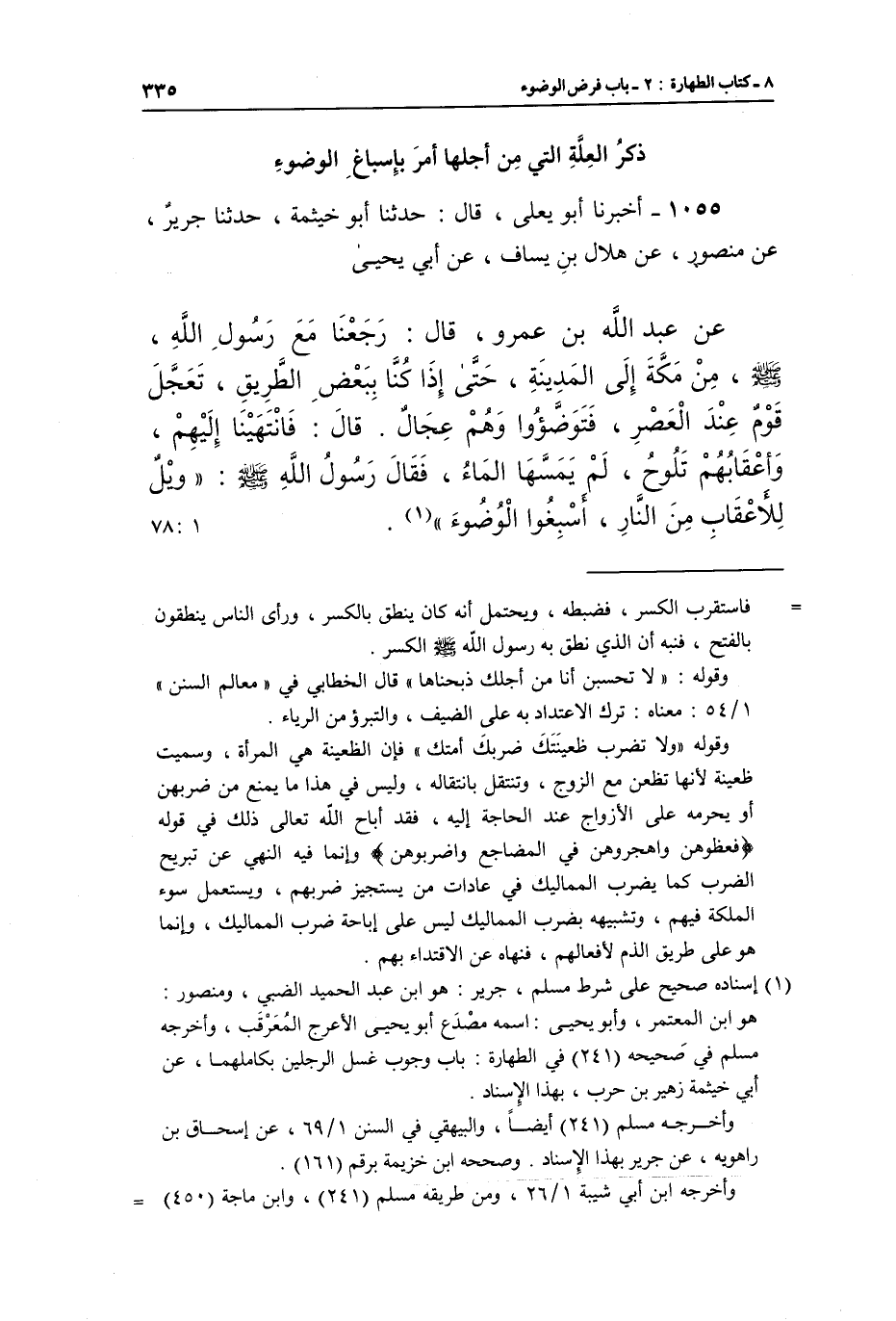 1055 - أَخْبَرَنَا أَبُو يَعْلَى، قَالَ: حَدَّثَنَا أَبُو خَيْثَمَةَ، حَدَّثَنَا جَرِيرٌ، عَنْ مَنْصُورٍ، عَنْ هِلَالِ بْنِ يَسَافٍ، عَنْ أَبِي يَحْيَى عَنْ عَبْدِ اللَّهِ بْنِ عَمْرٍو، قَالَ: رَجَعْنَا مَعَ رَسُولِ اللَّهِ، صَلَّى اللَّهُ عَلَيْهِ وَسَلَّمَ، مِنْ مَكَّةَ إِلَى الْمَدِينَةِ، حَتَّى إِذَا كُنَّا بِبَعْضِ الطَّرِيقِ، تَعَجَّلَ قَوْمٌ عِنْدَ الْعَصْرِ، فَتَوَضَّؤُوا وَهُمْ عِجَالٌ. قَالَ: فَانْتَهَيْنَا إِلَيْهِمْ، وَأَعْقَابُهُمْ تَلُوحُ، لَمْ يَمَسَّهَا الْمَاءُ، فَقَالَ رَسُولُ اللَّهِ صَلَّى اللَّهُ عَلَيْهِ وَسَلَّمَ: "وَيْلٌ لِلْأَعْقَابِ مِنَ النَّارِ، أَسْبِغُوا الْوُضُوءَ" 1. 78:1