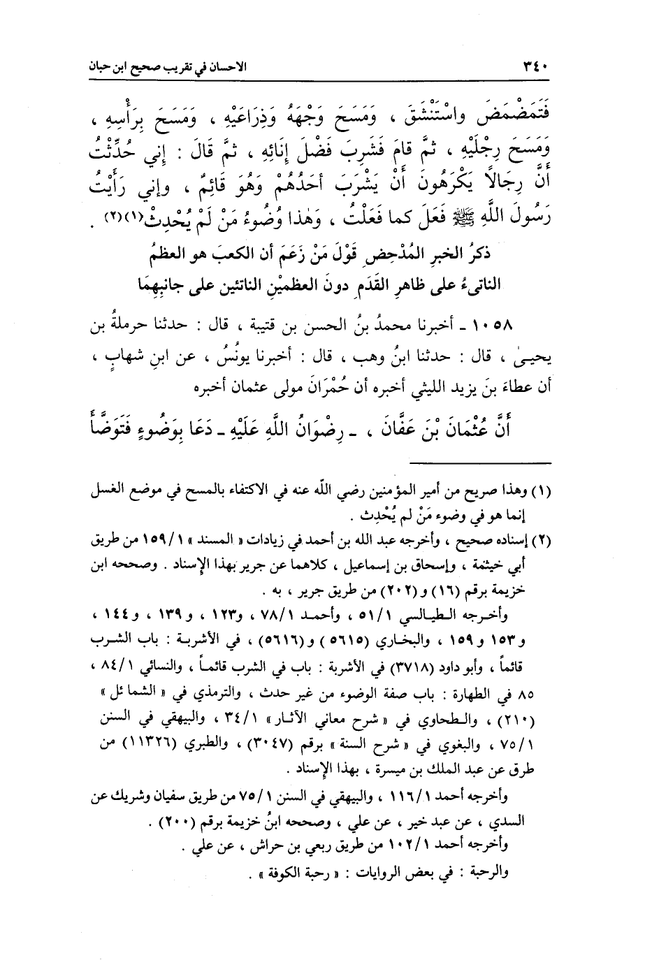 1058 - أَخْبَرَنَا مُحَمَّدُ بْنُ الْحَسَنِ بْنِ قُتَيْبَةَ، قَالَ: حَدَّثَنَا حَرْمَلَةُ بْنُ يَحْيَى، قَالَ: حَدَّثَنَا ابْنُ وهب، قال: أخبرنا يونس، عن بن شِهَابٍ أَنَّ عَطَاءَ بْنَ يَزِيدَ اللَّيْثِيَّ أَخْبَرَهُ أَنَّ حُمْرَانَ مَوْلَى عُثْمَانَ أَخْبَرَهُ أَنَّ عُثْمَانَ بْنَ عَفَّانَ، -رِضْوَانُ اللَّهِ عَلَيْهِ- دَعَا بِوَضُوءٍ فتوضأذكر الْخَبَرِ الْمُدْحِضِ قَوْلَ مَنْ زَعَمَ أَنَّ الْكَعْبَ هو العظم الناتىء عَلَى ظَاهِرِ الْقَدَمِ دُونَ الْعَظْمَيْنِ النَّاتِئَيْنِ عَلَى جَانِبِهِمَا