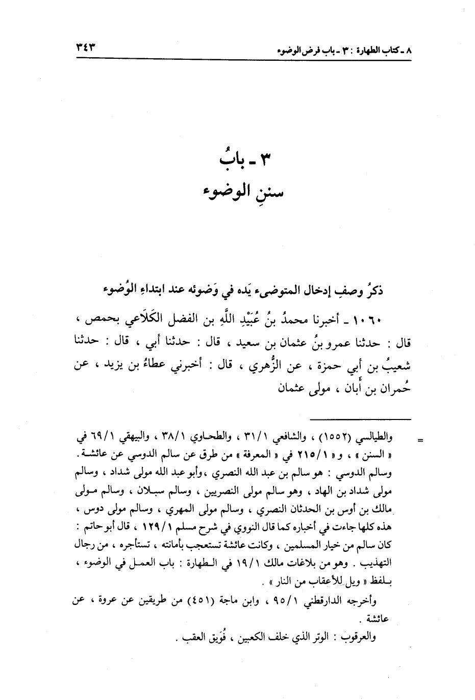1060 - أَخْبَرَنَا مُحَمَّدُ بْنُ عُبَيْدِ اللَّهِ بْنِ الْفَضْلِ الْكَلَاعِيُّ بِحِمْصَ، قَالَ: حَدَّثَنَا عَمْرُو بْنُ عُثْمَانَ بْنِ سَعِيدٍ، قَالَ: حَدَّثَنَا أَبِي، قَالَ: حَدَّثَنَا شُعَيْبُ بْنُ أَبِي حَمْزَةَ، عَنِ الزُّهْرِيِّ، قَالَ: أَخْبَرَنِي عَطَاءُ بْنُ يَزِيدَ، عَنْ حُمْرَانَ بْنِ أَبَانَ مولى عثمانباب سنن الوضوء