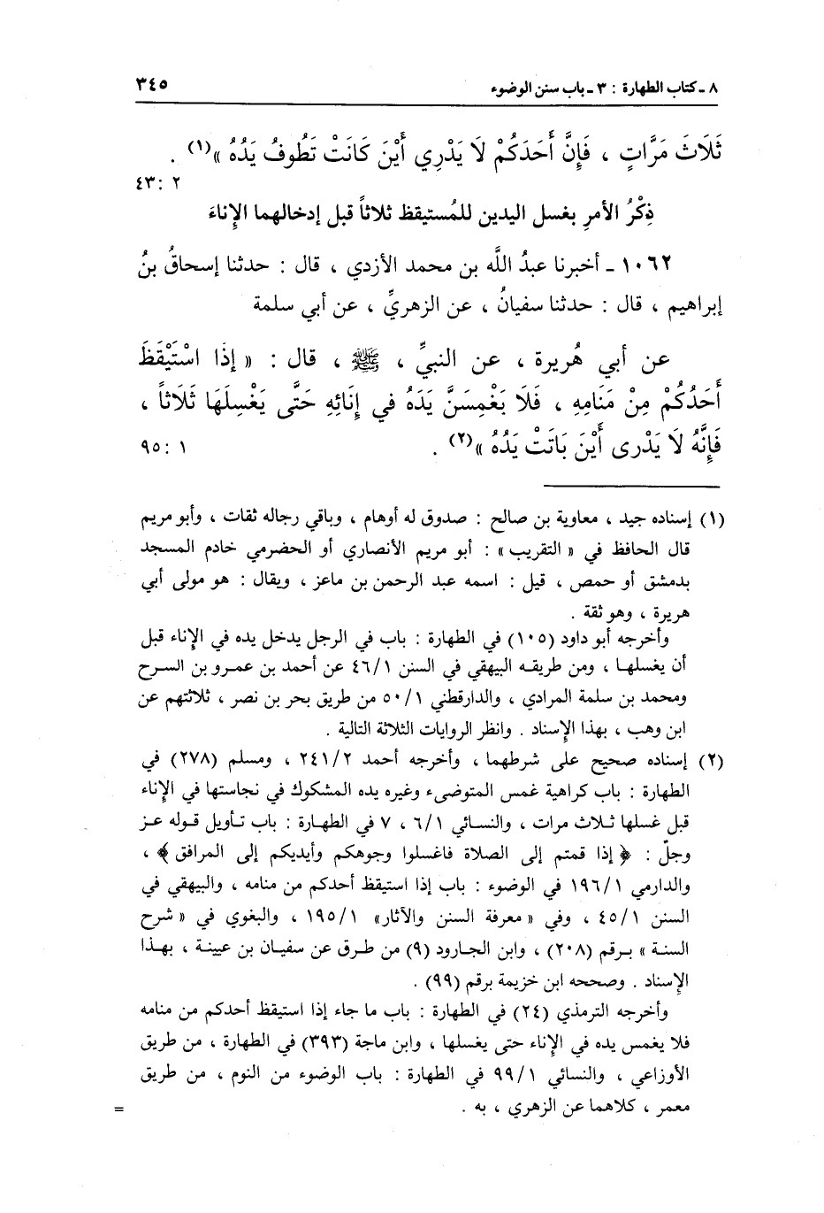1062 - أَخْبَرَنَا عَبْدُ اللَّهِ بْنُ مُحَمَّدٍ الْأَزْدِيُّ، قَالَ: حَدَّثَنَا إِسْحَاقُ بْنُ إِبْرَاهِيمَ، قَالَ: حَدَّثَنَا سُفْيَانُ، عَنِ الزُّهْرِيِّ، عَنْ أَبِي سَلَمَةَ عَنْ أَبِي هُرَيْرَةَ، عَنِ النَّبِيِّ، صَلَّى اللَّهُ عَلَيْهِ وَسَلَّمَ، قَالَ: "إِذَا اسْتَيْقَظَ أَحَدُكُمْ مِنْ مَنَامِهِ، فَلَا يَغْمِسَنَّ يَدَهُ فِي إِنَائِهِ حَتَّى يَغْسِلَهَا ثَلَاثًا، فَإِنَّهُ لَا يَدْرِي أَيْنَ بَاتَتْ يده" 2. 95:1