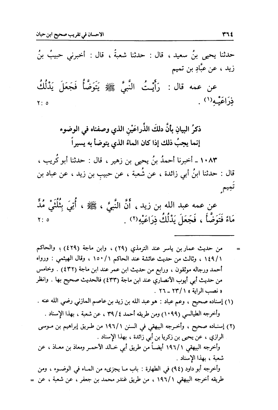 1083 - أَخْبَرَنَا أَحْمَدُ بْنُ يَحْيَى بْنِ زُهَيْرٍ، قَالَ: حَدَّثَنَا أَبُو كريب، قال: حدثنا بن أَبِي زَائِدَةَ، عَنْ شُعْبَةَ، عَنْ حَبِيبِ بْنِ زَيْدٍ، عَنْ عَبَّادِ بْنِ تَمِيمٍ عَنْ عَمِّهِ عَبْدِ اللَّهِ بْنِ زَيْدٍ، أَنَّ النَّبِيَّ، صَلَّى اللَّهُ عَلَيْهِ وَسَلَّمَ، أُتِيَ بِثُلُثَيْ مُدٍّ مَاءً فتوضأ، فجعل يدلك ذراعيه2. 2:5