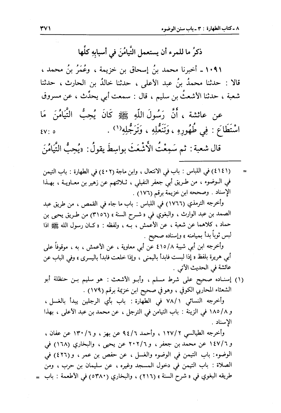 1091 - أَخْبَرَنَا مُحَمَّدُ بْنُ إِسْحَاقَ بْنِ خُزَيْمَةَ، وَعُمَرُ بْنُ مُحَمَّدٍ، قَالَا: حَدَّثَنَا مُحَمَّدُ بْنُ عَبْدِ الْأَعْلَى، حَدَّثَنَا خَالِدُ بْنُ الْحَارِثِ، حَدَّثَنَا شُعْبَةُ، حَدَّثَنَا الْأَشْعَثُ بْنُ سُلَيْمٍ قَالَ: سَمِعْتُ أَبِي يُحَدِّثُ، عَنْ مَسْرُوقٍ عَنْ عَائِشَةَ، أَنَّ رَسُولَ اللَّهِ صَلَّى اللَّهُ عَلَيْهِ وَسَلَّمَ كَانَ يُحِبُّ التَّيَامُنَ مَا اسْتَطَاعَ: فِي طُهُورِهِ، وَتَنَعُّلِهِ، وَتَرَجُّلِهِ1. 47:5