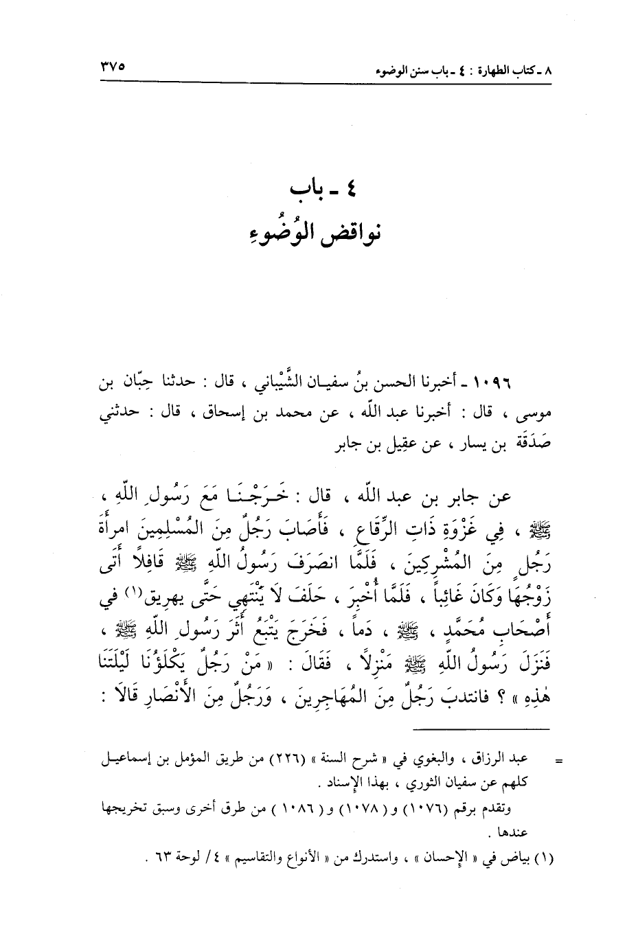 1096 - أَخْبَرَنَا الْحَسَنُ بْنُ سُفْيَانَ الشَّيْبَانِيُّ، قَالَ: حَدَّثَنَا حِبَّانُ بْنُ مُوسَى، قَالَ: أَخْبَرَنَا عَبْدُ اللَّهِ، عَنْ مُحَمَّدِ بْنِ إِسْحَاقَ، قَالَ: حَدَّثَنِي صَدَقَةُ بْنُ يَسَارٍ، عَنْ عَقِيلِ بْنِ جَابِرٍ عَنْ جَابِرِ بْنِ عَبْدِ اللَّهِ، قَالَ: خَرَجْنَا مَعَ رَسُولِ اللَّهِ، صَلَّى اللَّهُ عَلَيْهِ وَسَلَّمَ، في غزوة ذات الرقاع، فأصاب رَجُلٌ مِنَ الْمُسْلِمِينَ امْرَأَةَ رَجُلٍ مِنَ الْمُشْرِكِينَ، فَلَمَّا انْصَرَفَ رَسُولُ اللَّهِ صَلَّى اللَّهُ عَلَيْهِ وَسَلَّمَ قَافِلًا أَتَى زَوْجُهَا وَكَانَ غَائِبًا، فَلَمَّا أُخْبِرَ، حَلَفَ لَا يَنْتَهِي حَتَّى يُهْرِيقَ1 فِي أَصْحَابِ مُحَمَّدٍ، صَلَّى اللَّهُ عَلَيْهِ وَسَلَّمَ، دَمًا، فَخَرَجَ يَتْبَعُ أَثَرَ رَسُولِ اللَّهِ صَلَّى اللَّهُ عَلَيْهِ وَسَلَّمَ، فَنَزَلَ رَسُولُ اللَّهِ صَلَّى اللَّهُ عَلَيْهِ وَسَلَّمَ مَنْزِلًا، فَقَالَ: "مَنْ رَجُلٌ يَكْلَؤُنَا لَيْلَتَنَا هَذِهِ"؟ فَانْتُدِبَ رَجُلٌ مِنَ الْمُهَاجِرِينَ، وَرَجُلٌ من الأنصار قالا: