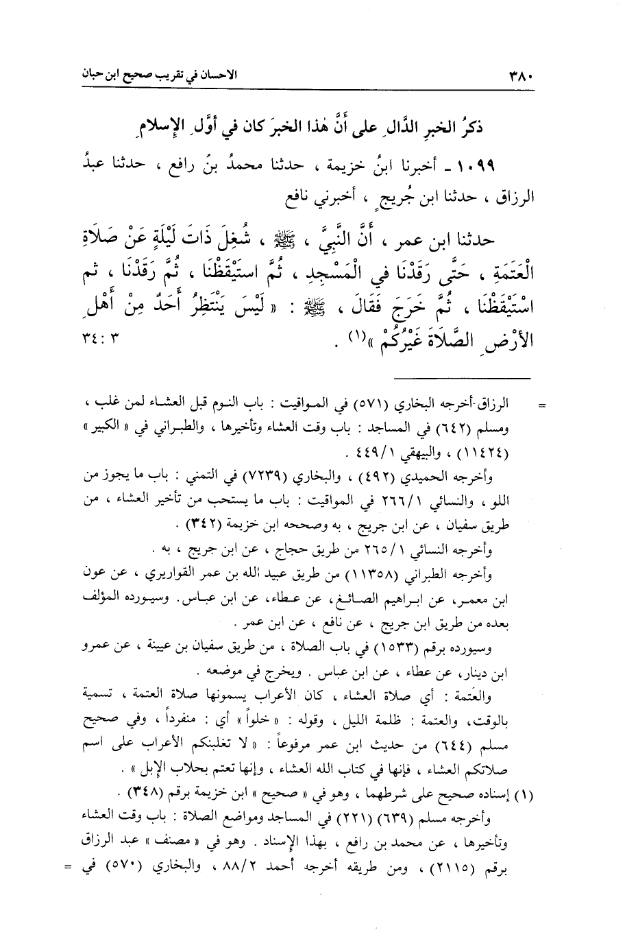 1099 - أخبرنا بْنِ خُزَيْمَةَ، حَدَّثَنَا مُحَمَّدُ بْنُ رَافِعٍ، حَدَّثَنَا عبد الرزاق، حدثنا بن جُرَيْجٍ، أَخْبَرَنِي نَافِعٌ، حَدَّثَنَا ابْنِ عُمَرَ، إِنَّ النَّبِيَّ، صَلَّى اللَّهُ عَلَيْهِ وَسَلَّمَ، شُغِلَ ذَاتَ لَيْلَةٍ عَنْ صَلَاةِ الْعَتَمَةِ، حَتَّى رَقَدْنَا فِي الْمَسْجِدِ، ثُمَّ اسْتَيْقَظْنَا، ثُمَّ رَقَدْنَا، ثُمَّ اسْتَيْقَظْنَا، ثُمَّ خَرَجَ فَقَالَ، صَلَّى اللَّهُ عَلَيْهِ وَسَلَّمَ: "لَيْسَ يَنْتَظِرُ أَحَدٌ مِنْ أَهْلِ الْأَرْضِ الصَّلَاةَ غيركم" 1. 34:3