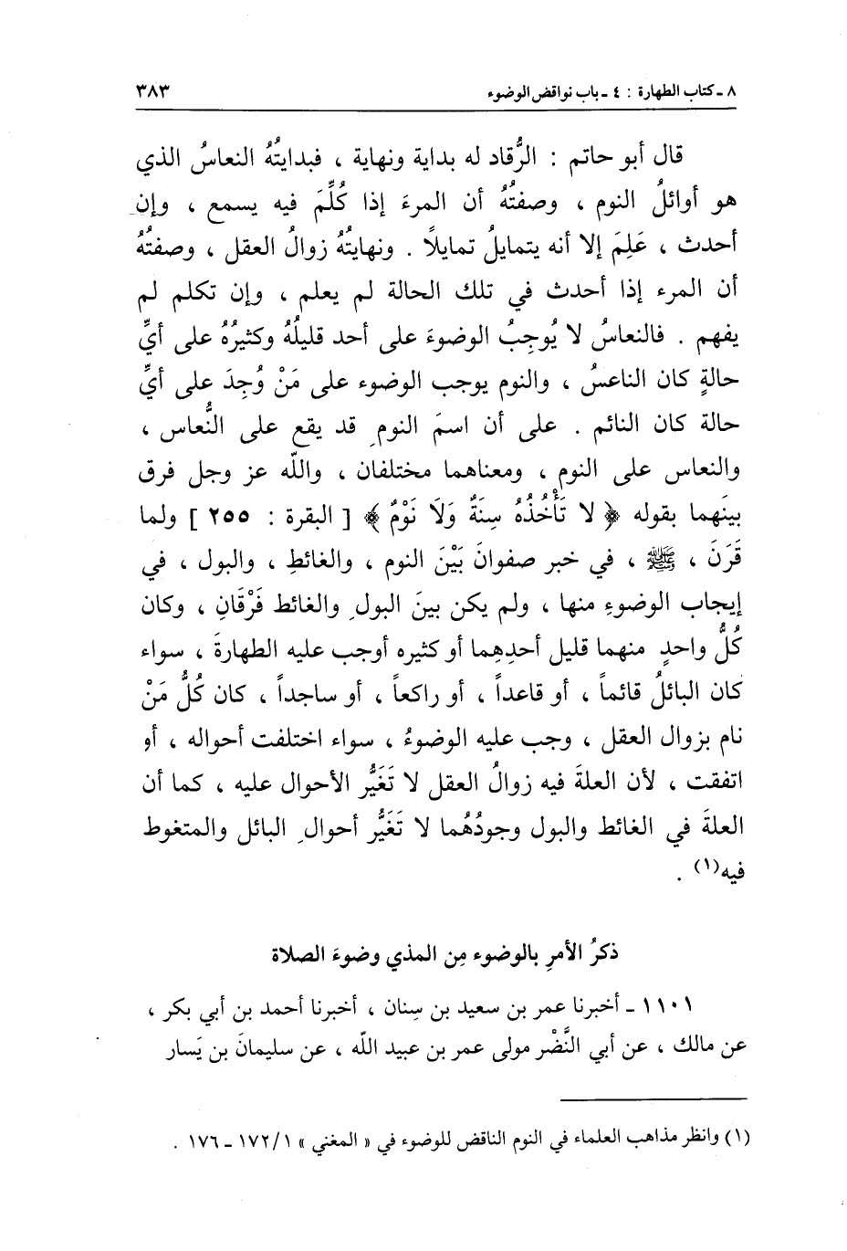 قَالَ أَبُو حَاتِمٍ: الرُّقَادُ لَهُ بِدَايَةٌ وَنِهَايَةٌ، فَبِدَايَتُهُ النُّعَاسُ الَّذِي هُوَ أَوَائِلُ النَّوْمِ، وَصِفَتُهُ أَنَّ الْمَرْءَ إِذَا كُلِّمَ فِيهِ يَسْمَعُ، وَإِنْ أَحْدَثَ، عَلِمَ إِلَّا أَنَّهُ يَتَمَايَلُ تَمَايُلًا. وَنِهَايَتُهُ زَوَالُ الْعَقْلِ، وَصِفَتُهُ أَنَّ الْمَرْءَ إِذَا أَحْدَثَ فِي تِلْكَ الْحَالَةِ لَمْ يَعْلَمْ، وَإِنْ تَكَلَّمَ لَمْ يَفْهَمْ. فَالنُّعَاسُ لَا يُوجِبُ الْوُضُوءَ عَلَى أَحَدٍ قَلِيلُهُ وَكَثِيرُهُ عَلَى أَيِّ حَالَةٍ كَانَ النَّاعِسُ، وَالنَّوْمُ يُوجِبُ الْوُضُوءَ عَلَى مَنْ وُجِدَ عَلَى أَيِّ حَالَةٍ كَانَ النَّائِمُ. عَلَى أَنَّ اسْمَ النَّوْمِ قَدْ يَقَعُ عَلَى النُّعَاسِ، وَالنُّعَاسُ عَلَى النَّوْمِ، وَمَعْنَاهُمَا مُخْتَلِفَانِ، وَاللَّهُ عَزَّ وَجَلَّ فَرَّقَ بَيْنَهُمَا بِقَوْلِهِ: {لَا تَأْخُذُهُ سِنَةٌ وَلا نَوْمٌ} [البقرة: 255] وَلَمَّا قَرَنَ، صَلَّى اللَّهُ عَلَيْهِ وَسَلَّمَ، فِي خَبَرِ صَفْوَانَ بَيْنَ النَّوْمِ، وَالْغَائِطِ، وَالْبَوْلِ، فِي إِيجَابِ الْوُضُوءِ مِنْهَا، وَلَمْ يَكُنْ بَيْنَ الْبَوْلِ وَالْغَائِطِ فُرْقَانٌ، وَكَانَ كُلُّ وَاحِدٍ مِنْهُمَا قَلِيلُ أَحَدِهِمَا أَوْ كَثِيرُهُ أَوْجَبَ عَلَيْهِ الطَّهَارَةَ، سَوَاءً كَانَ الْبَائِلُ قَائِمًا، أَوْ قَاعِدًا، أو راكعا، أو ساجداً، كان كانت كُلُّ مَنْ نَامَ بِزَوَالِ الْعَقْلِ، وَجَبَ عَلَيْهِ الْوُضُوءُ، سَوَاءً اخْتَلَفَتْ أَحْوَالُهُ، أَوِ اتَّفَقَتْ، لِأَنَّ الْعِلَّةَ فِيهِ زَوَالُ الْعَقْلِ لَا تَغَيُّرُ الْأَحْوَالِ عَلَيْهِ، كَمَا أَنَّ الْعِلَّةَ فِي الْغَائِطِ وَالْبَوْلِ وُجُودُهُمَا لَا تَغَيُّرُ أَحْوَالِ الْبَائِلِ وَالْمُتَغَوِّطِ فِيهِ1.