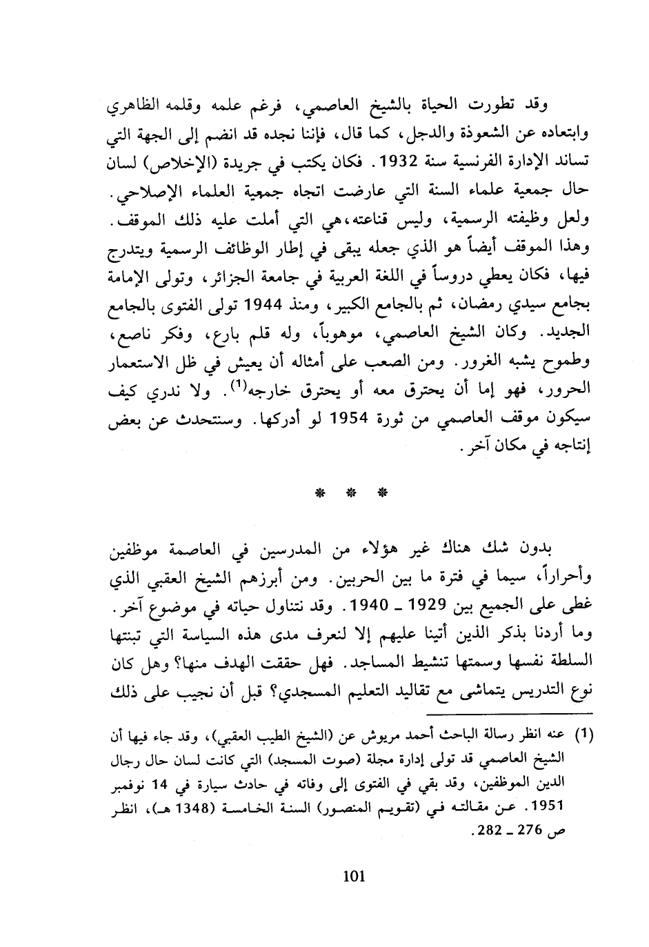 (¬1) عنه انظر رسالة الباحث أحمد مريوش عن (الشيخ الطيب العقبي)، وقد جاء فيها أن الشيخ العاصمي قد تولى إدارة مجلة (صوت المسجد) التي كانت لسان حال رجال الدين الموظفين، وقد بقي في الفتوى إلى وفاته في حادث سيارة في 14 نوفمبر 1951. عن مقالته في (تقويم المنصور) السنة الخامسة (1348 هـ)، انظر ص 276 - 282.