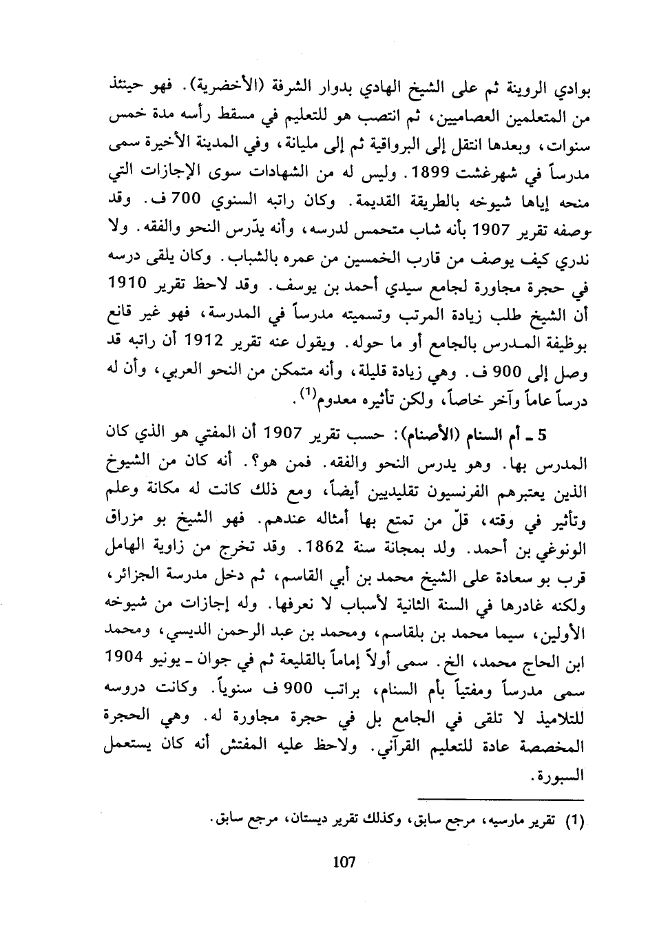 5 - أم السنام (الأصنام): حسب تقرير 1907 أن المفتي هو الذي كان المدرس بها. وهو يدرس النحو والفقه. فمن هو؟. أنه كان من الشيوخ الذين يعتبرهم الفرنسيون تقليديين أيضا، ومع ذلك كانت له مكانة وعلم وتأثير في وقته، قل من تمتع بها أمثاله عندهم. فهو الشيخ بو مزراق الونوغي بن أحمد. ولد بمجانة سنة 1862. وقد تخرج من زاوية الهامل قرب بو سعادة على الشيخ محمد بن أبي القاسم، ثم دخل مدرسة الجزائر، ولكنه غادرها في السنة الثانية لأسباب لا نعرفها. وله إجازات من شيوخه الأولين، سيما محمد بن بلقاسم، ومحمد بن عبد الرحمن الديسي، ومحمد ابن الحاج محمد، الخ. سمى أولا إماما بالقليعة ثم في جوان - يونيو 1904 سمى مدرسا ومفتيا بأم السنام، براتب 955 ت سنويا. وكانت دروسه للتلاميذ لا تلقى في الجامع بل في حجرة مجاورة له. وهي الحجرة المخصصة عادة للتعليم القرآني. ولاحظ عليه المفتش أنه كان يستعمل السبورة.