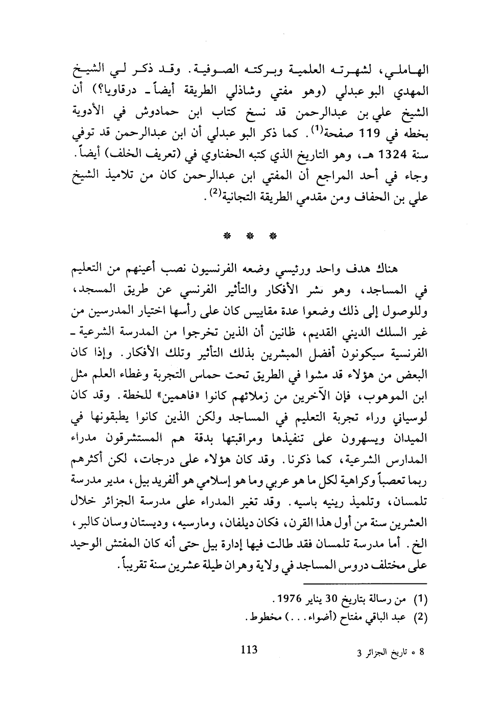 الهاملي، لشهرته العلمية وبركته الصوفية. وقد ذكر لي الشيخ المهدي البوعبدلي (وهو مفتي وشاذلي الطريقة أيضا - درقاويا؟) أن الشيخ علي بن عبد الرحمن قد نسخ كتاب ابن حمادوش في الأدوية بخطه في 119 صفحة (¬1). كما ذكر البوعبدلي أن ابن عبد الرحمن قد توفي سنة 1324 هـ، وهو التاريخ الذي كتبه الحفناوي في (تعريف الخلف) أيضا. وجاء في أحد المراجع أن المفتي ابن عبد الرحمن كان من تلاميذ الشيخ علي بن الحفاف ومن مقدمي الطريقة التجانية (¬2).