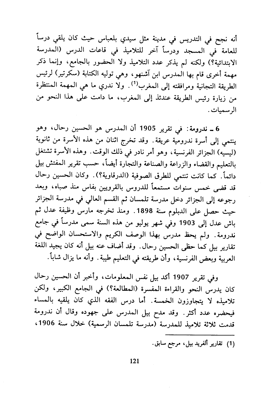 وفي تقرير 1907 أكد بيل نفس المعلومات، وأخبر أن الحسين رحال كان يدرس النحو والقراءة المفسرة (المطالعة؟) في الجامع الكبير، ولكن تلاميذه لا يتجاوزون الخمسة. أما درس الفقه الذي كان يلقيه بالمساء فيحضره عدد أكثر. وقد مدح بيل المدرس على جهوده وقال أن ندرومة قدمت ثلاثة تلاميذ للمدرسة (مدرسة تلمسان الرسمية) خلال سنة 1906،
