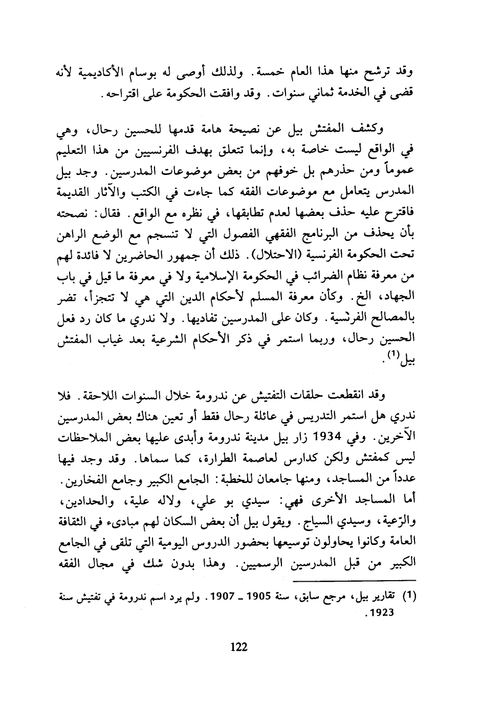 وقد انقطعت حلقات التفتيش عن ندرومة خلال السنوات اللاحقة. فلا ندري هل استمر التدريس في عائلة رحال فقط أو تعين هناك بعض المدرسين الآخرين. وفي 1934 زار بيل مدينة ندرومة وأبدى عليها بعض الملاحظات ليس كمفتش ولكن كدارس لعاصمة الطرارة، كما سماها. وقد وجد فيها عددا من المساجد، ومنها جامعان للخطبة: الجامع الكبير وجامع الفخارين. أما المساجد الأخرى فهي: سيدي بو علي، ولاله علية، والحدادين، والرعية، وسيدي السياج. ويقول بيل أن بعض السكان لهم مبادئ في الثقافة العامة وكانوا يحاولون توسيعها بحضور الدروس اليومية التي تلقى في الجامع الكبير من قبل المدرسين الرسميين. وهذا بدون شك في مجال الفقه
