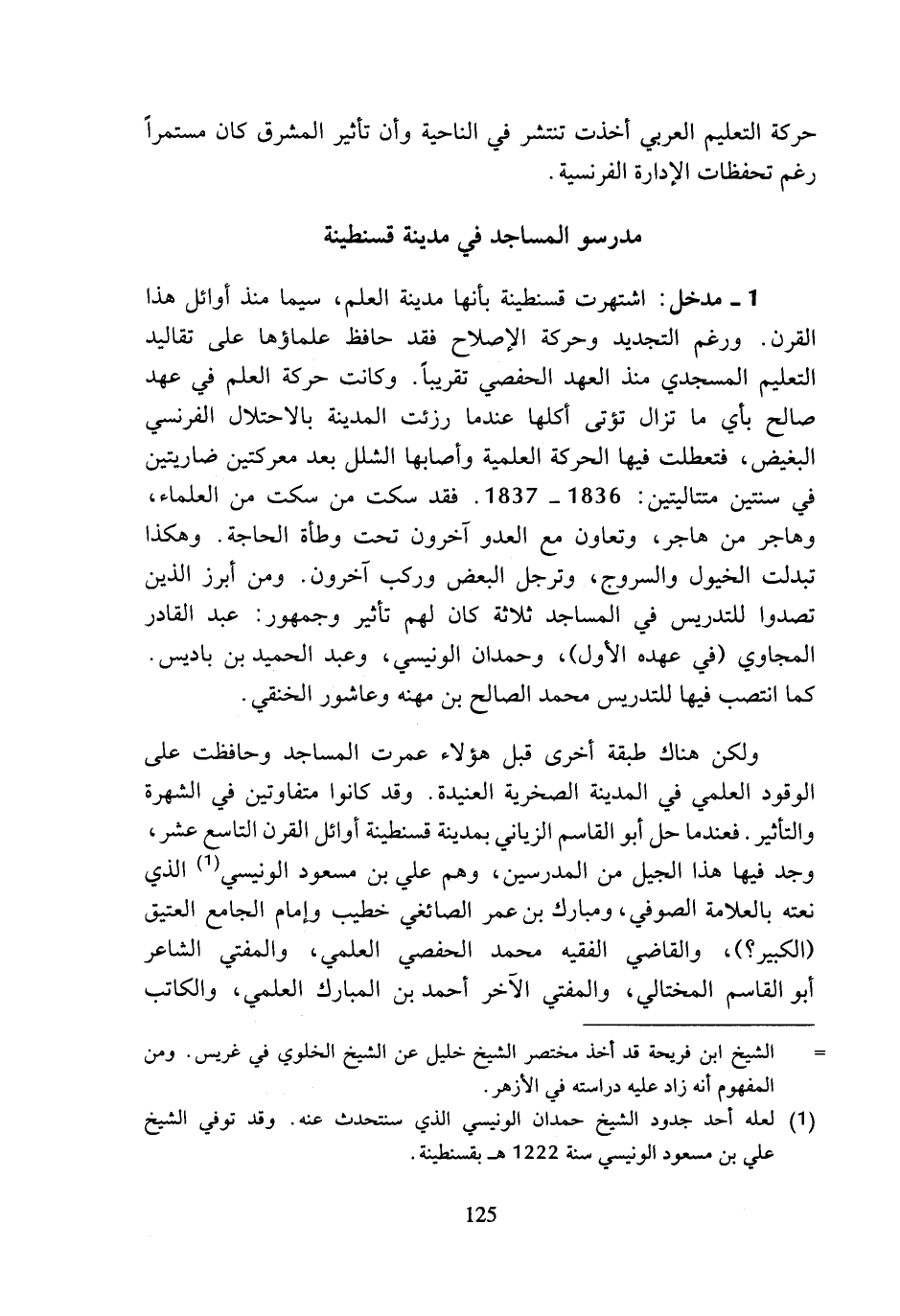 1 - مدخل: اشتهرت قسنطينة بأنها مدينة العلم، سيما منذ أوائل هذا القرن. ورغم التجديد وحركة الإصلاح فقد حافظ علماؤها على تقاليد التعليم المسجدي منذ العهد الحفصي تقريبا. وكانت حركة العلم في عهد صالح باي ما تزال تؤتى أكلها عندما رزئت المدينة بالاحتلال الفرنسي البغيض، فتعطلت فيها الحركة العلمية وأصابها الشلل بعد معركتين ضاريتين في سنتين متتاليتين: 1836 - 1837. فقد سكت من سكت من العلماء، وهاجر من هاجر، وتعاون مع العدو آخرون تحت وطأة الحاجة. وهكذا تبدلت الخيول والسروج، وترجل البعض وركب آخرون. ومن أبرز الذين تصدوا للتدريس في المساجد ثلاثة كان لهم تأثير وجمهور: عبد القادر المجاوي (في عهده الأول)، وحمدان الونيسي، وعبد الحميد بن باديس. كما انتصب فيها للتدريس محمد الصالح بن مهنه وعاشور الخنقي.