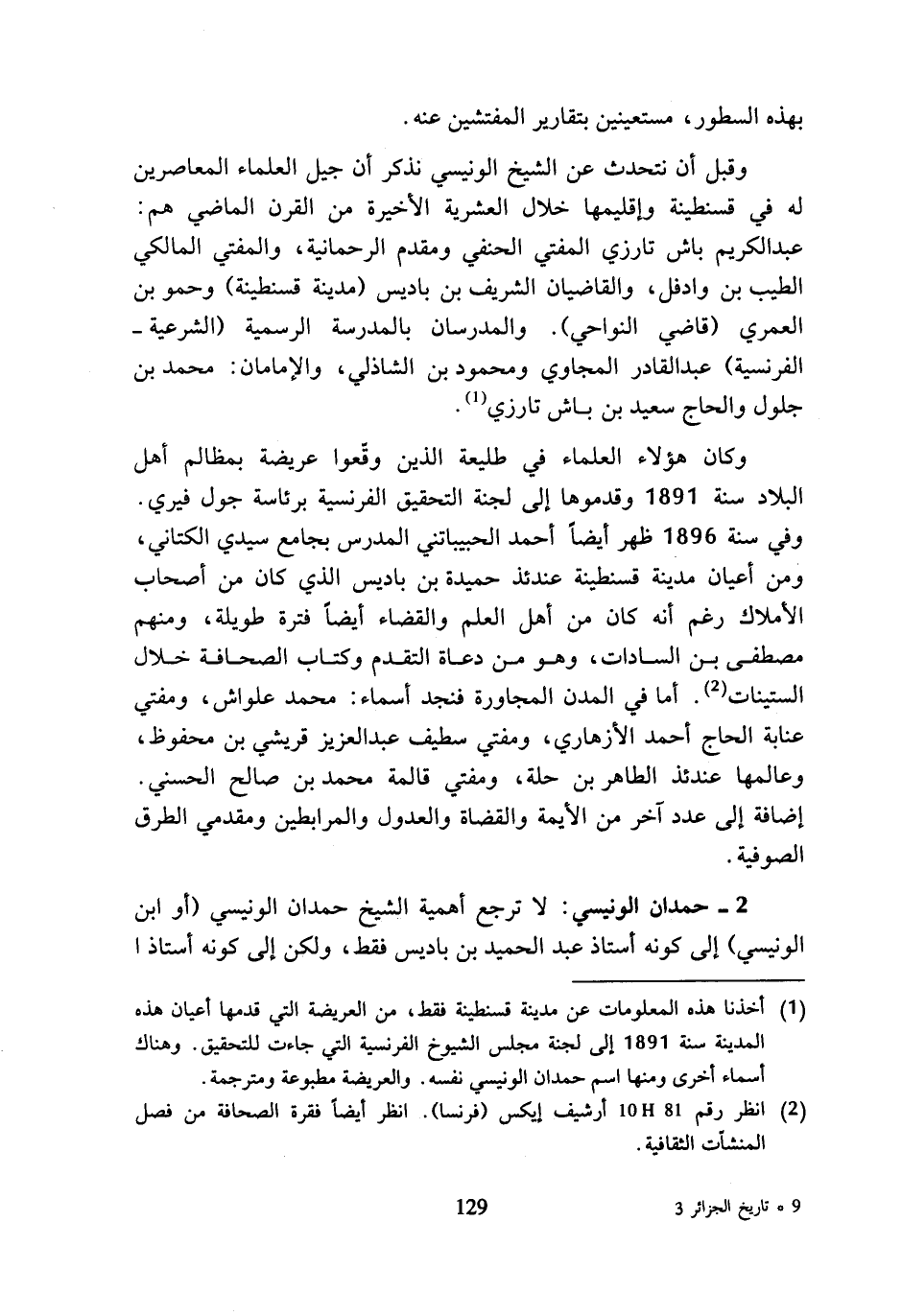 (¬1) أخذنا هذه المعلومات عن مدينة قسنطينة فقط، من العريضة التي قدمها أعيان هذه المدينة سنة 1891 إلى لجنة مجلس الشيوخ الفرنسية التي جاءت للتحقيق. وهناك أسماء أخرى ومنها اسم حمدان الونيسي نفسه. والعريضة مطبوعة ومترجمة.