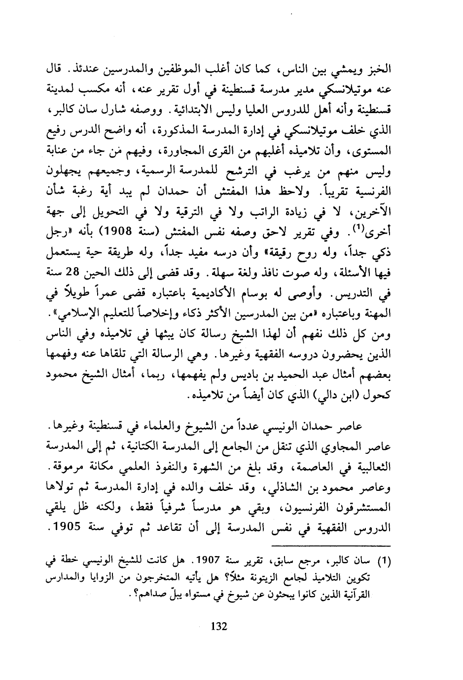 الخبز ويمشي بين الناس، كما كان أغلب الموظفين والمدرسين عندئذ. قال عنه موتيلانسكي مدير مدرسة قسنطينة في أول تقرير عنه، أنه مكسب لمدينة قسنطينة وأنه أهل للدروس العليا وليس الابتدائية. ووصفه شارل سان كالبر، الذي خلف موتيلانسكي في إدارة المدرسة المذكورة، أنه واضح الدرس رفيع المستوى، وأن تلاميذه أغلبهم من القرى المجاورة، وفيهم من جاء من عنابة وليس منهم من يرغب في الترشح للمدرسة الرسمية، وجميعهم يجهلون الفرنسية تقريبا. ولاحظ هذا المفتش أن حمدان لم يبد أية رغبة شأن الآخرين، لا في زيادة الراتب ولا في الترقية ولا في التحويل إلى جهة أخرى (¬1). وفي تقرير لاحق وصفه نفس المفتش (سنة 1908) بأنه (رجل ذكي جدا، وله روح رقيقة) وأن درسه مفيد جدا، وله طريقة حية يستعمل فيها الأسئلة، وله صوت نافذ ولغة سهلة. وقد قضى إلى ذلك الحين 28 سنة في التدريس. وأوصى له بوسام أكاديمية باعتباره قضى عمرا طويلا في المهنة وباعتباره (من بين المدرسين أكثر ذكاء وإخلاصا للتعليم الإسلامي). ومن كل ذلك نفهم أن لهذا الشيخ رسالة كان يبثها في تلاميذه وفي الناس الذين يحضرون دروسه الفقهية وغيرها. وهي الرسالة التي تلقاها عنه وفهمها بعضهم أمثال عبد الحميد بن باديس ولم يفهمها، ربما، أمثال الشيخ محمود كحول (ابن دالي) الذي كان أيضا من تلاميذه.
