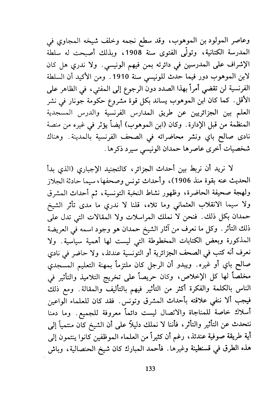 لا نريد أن نربط بين أحداث الجزائر، كالتجنيد الإجباري (الذي بدأ الحديث عنه بقوة منذ 1906)، وأحداث تونس وصحفها، سيما حادثة الجلاز ولهجة صحيفة الحاضرة، وظهور نشاط النخبة التونسية، ثم أحداث المشرق ولا سيما الانقلاب العثماني وما تلاه، قلنا لا ندري ما مدى تأثر الشيخ حمدان بكل ذلك. فنحن لا نملك المراسلات ولا المقالات التي تدل على ذلك التأثر. وكل ما نعرف من آثار الشيخ حمدان هو وجود اسمه في العريضة المذكورة وبعض الكتابات المخطوطة التي ليست لها أهمية سياسية. ولا نعرف أنه كتب في الصحف الجزائرية أو التونسية عندئذ، ولا حاضر في نادي صالح باي أو غيره. ويبدو أن الرجل كان ملتزما بمهنة التعليم المسجدي مخلصا لها كل الإخلاص، وكان حريصا على تخريج التلاميذ والتأثير في الناس بالكلمة والفكرة أكثر من التأثير فيهم بالتأليف والمقالة. ومع ذلك فيجب ألا ننفي علاقته بأحداث المشرق وتونس. فقد كان للعلماء الواعين أسلاك خاصة للمناجاة والاتصال ليست دائما معروفة للجميع. وما دمنا نتحدث عن التأثير والتأثر، فإننا لا نملك دليلا على أن الشيخ كان منتميا إلى أية طريقة صوفية عندئذ، رغم أن كثيرا من العلماء الموظفين كانوا ينتمون إلى هذه الطرق في قسنطينة وغيرها. فأحمد المبارك كان شيخ الحنصالية، وباش