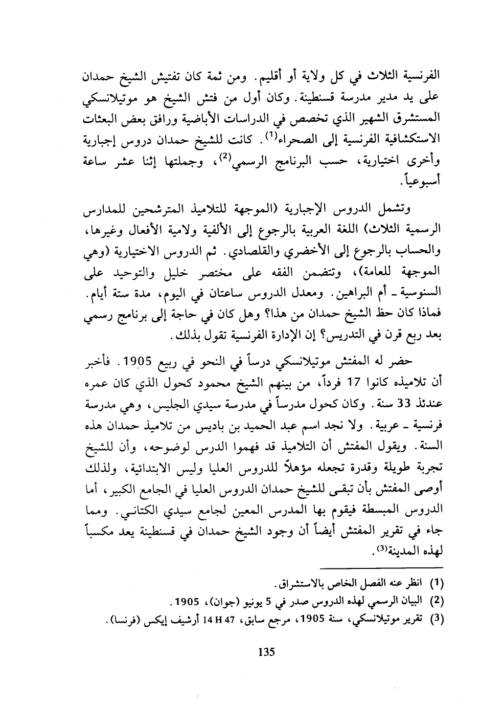 الفرنسية الثلاث في كل ولاية أو أقليم. ومن ثمة كان تفتيش الشيخ حمدان على يد مدير مدرسة قسنطينة. وكان أول من فتش الشيخ هو موتيلانسكي المستشرق الشهير الذي تخصص في الدراسات الأباضية ورافق بعض البعثات الاستكشافية الفرنسية إلى الصحراء (¬1). كانت للشيخ حمدان دروس إجبارية وأخرى اختيارية، حسب البرنامج الرسمي (¬2)، وجملتها إثنا عشر ساعة أسبوعيا.