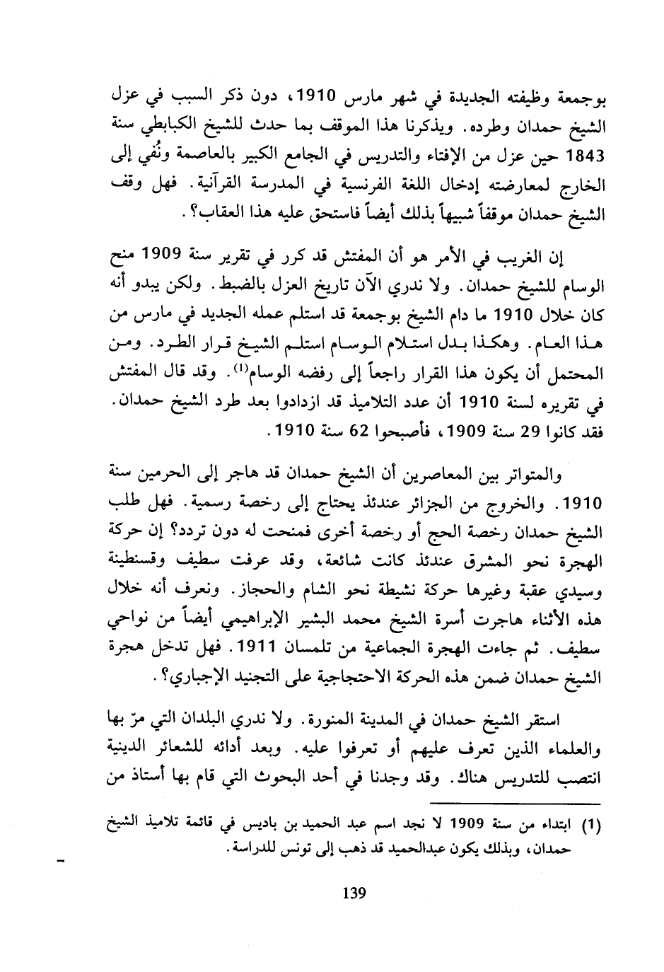 (¬1) ابتداء من سنة 1959 لا نجد اسم عبد الحميد بن باديس في قائمة تلاميذ الشيخ حمدان، وبذلك يكون عبد الحميد قد ذهب إلى تونس للدراسة.