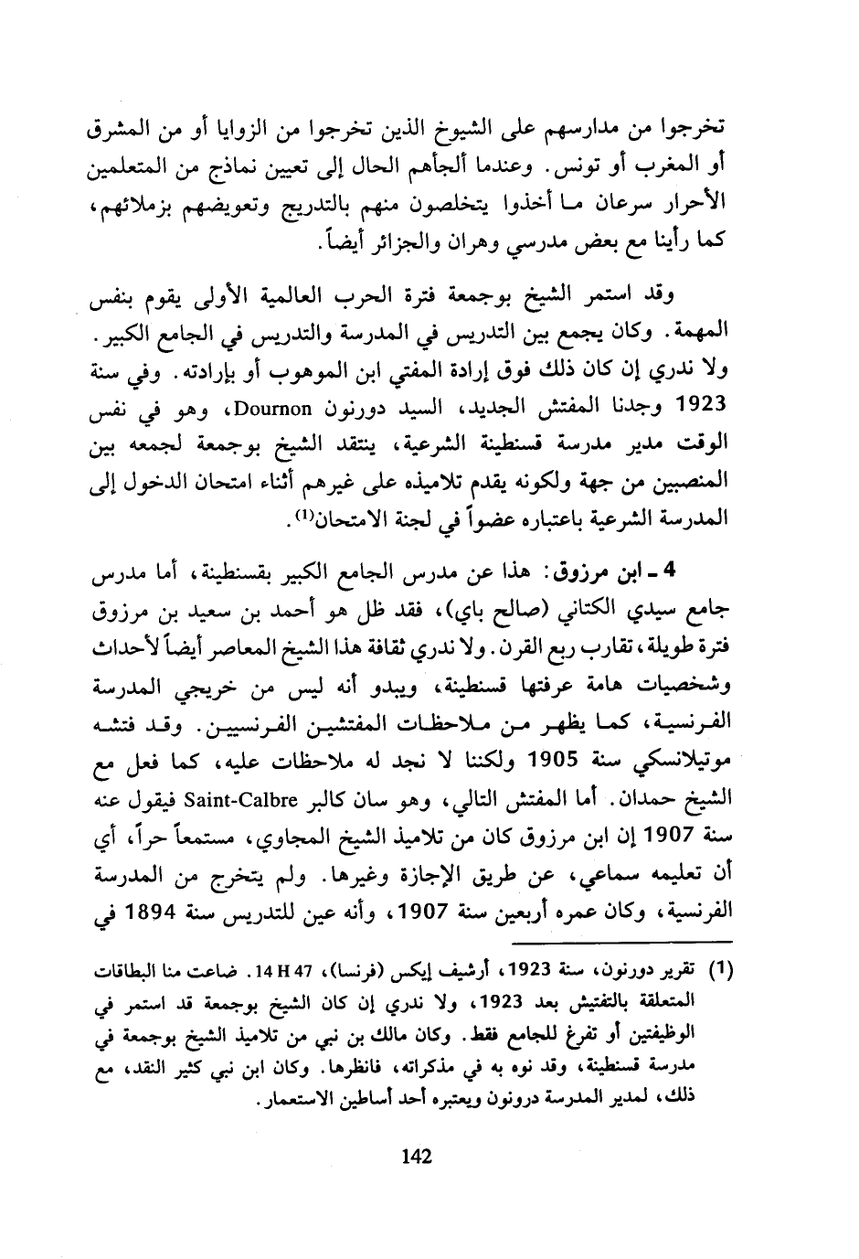 4 - ابن مرزوق: هذا عن مدرس الجامع الكبير بقسنطينة، أما مدرس جامع سيدي الكتاني (صالح باي)، فقد ظل هو أحمد بن سعيد بن مرزوق فترة طويلة، تقارب ربع القرن. ولا ندري ثقافة هذا الشيخ المعاصر أيضا لأحداث وشخصيات هامة عرفتها قسنطينة، ويبدو أنه ليس من خريجي المدرسة الفرنسية، كما يظهر من ملاحظات المفتشين الفرنسيين. وقد فتشه موتيلانسكي سنة 1905 ولكننا لا نجد له ملاحظات عليه، كما فعل مع الشيخ حمدان. أما المفتش التالي، وهو سان كالبر Saint-Calbre فيقول عنه سنة 1907 إن ابن مرزوق كان من تلاميذ الشيخ المجاوي، مستمعا حرا، أي أن تعليمه سماعي، عن طريق الإجازة وغيرها. ولم يتخرج من المدرسة الفرنسية، وكان عمره أربعين سنة 1907، وأنه عين للتدريس سنة 1894 في