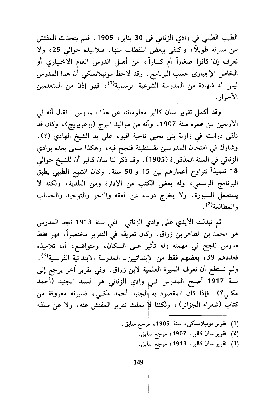 ثم تبدلت الأيدي على وادي الزناتي. ففي سنة 1913 نجد المدرس هو محمد بن الطاهر بن زراق. وكان تعريفه في التقرير مختصرا، فهو فقط مدرس ناجح في مهمته وله تأثير على السكان، ومتواضع، أما تلاميذه فعددهم 39، بعضهم فقط من الابتدائيين - المدرسة الابتدائية الفرنسية (¬3). ولم نستطع أن نعرف السيرة العلمية لابن زراق. وفي تقرير آخر يرجع إلى سنة 1917 أصبح المدرس في وادي الزناتي هو السيد الجنيد (أحمد مكي؟). فإذا كان المقصود به الجنيد أحمد مكي، فسيرته معروفة من كتاب (شعراء الجزائر)، ولكننا لا نملك تقرير المفتش عنه، ولا عن سلفه
