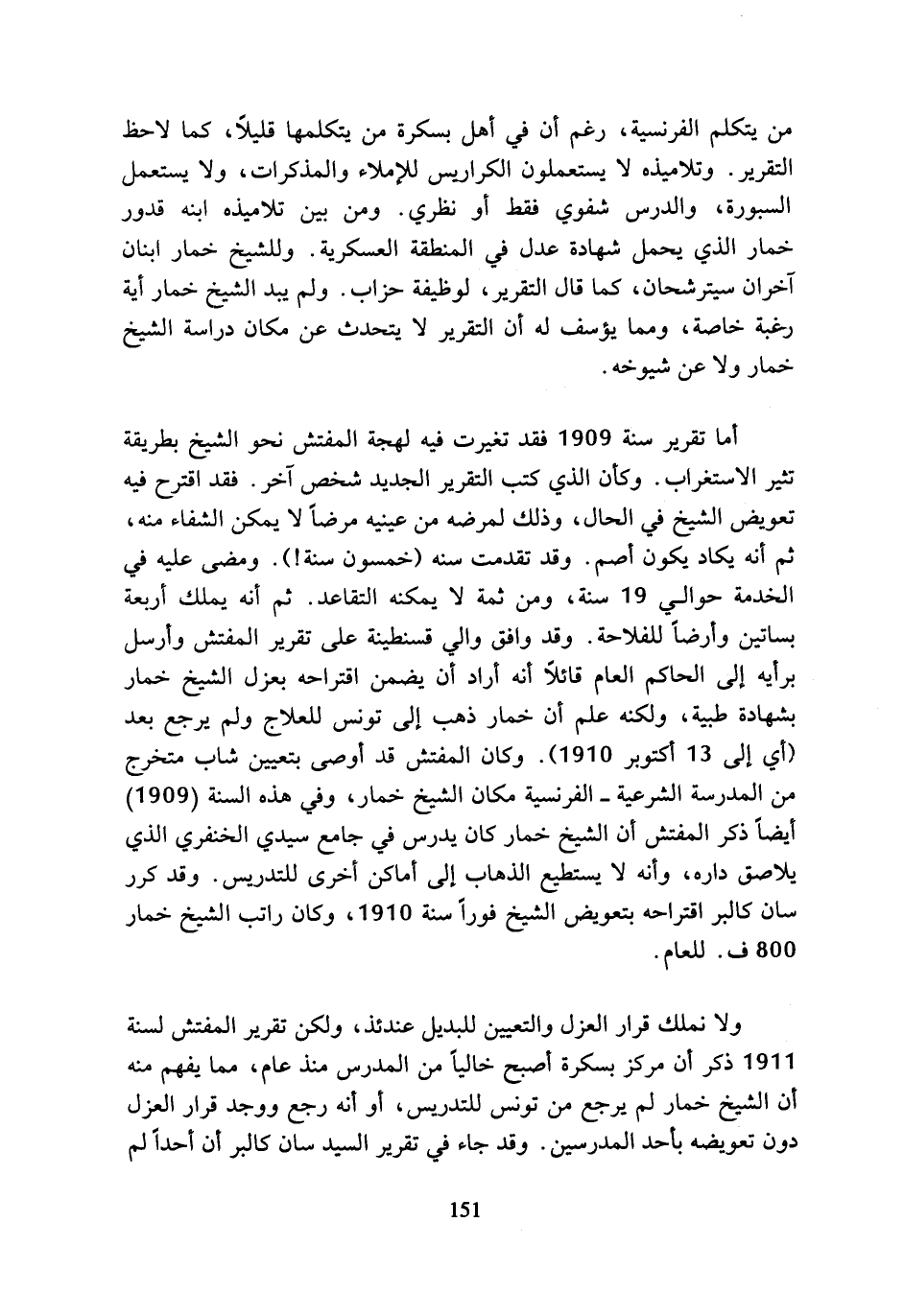 ولا نملك قرار العزل والتعيين للبديل عندئذ، ولكن تقرير المفتش لسنة 1911 ذكر أن مركز بسكرة أصبح خاليا من المدرس منذ عام، مما يفهم منه أن الشيخ خمار لم يرجع من تونس للتدريس، أو أنه رجع ووجد قرار العزل دون تعويضه بأحد المدرسين. وقد جاء في تقرير السيد سان كالبر أن أحدا لم