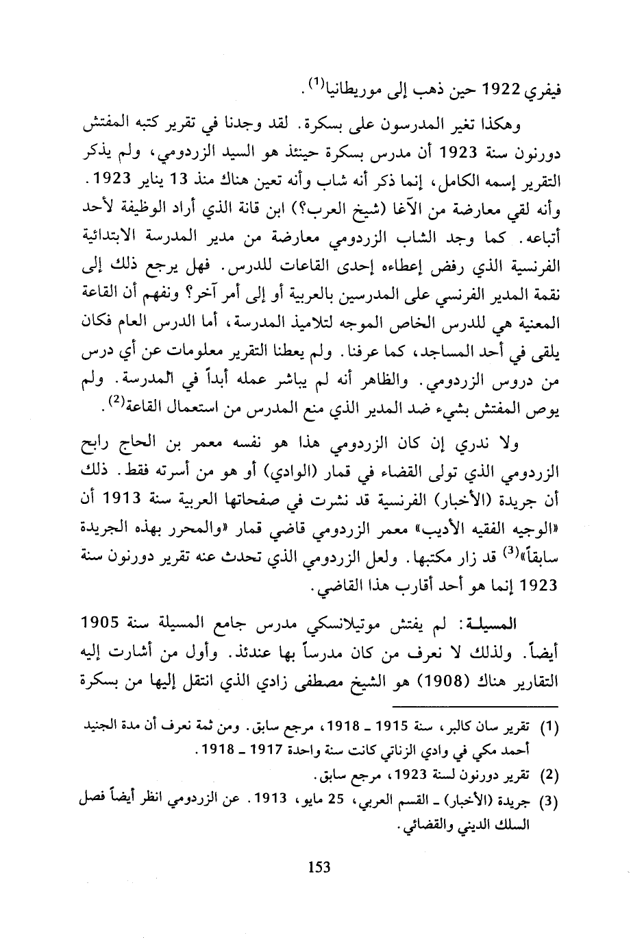 ولا ندري إن كان الزردومي هذا هو نفسه معمر بن الحاج رابح الزردومي الذي تولى القضاء في قمار (الوادي) أو هو من أسرته فقط. ذلك أن جريدة (الأخبار) الفرنسية قد نشرت في صفحاتها العربية سنة 1913 أن (الوجيه الفقيه الأديب) معمر الزردومي قاضي قمار (والمحرر بهذه الجريدة سابقا) (¬3) قد زار مكتبها. ولعل الزردومي الذي تحدث عنه تقرير دورنون سنة 1923 إنما هو أحد أقارب هذا القاضي.