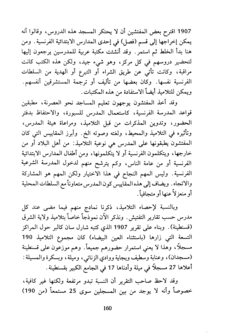 1907 اقترح بعص المفتشين أن لا يحتكر المسجد هذه الدروس، وقالوا أنه يمكن إخراجها إلى قسم (فصل) في إحدى المدارس الابتدائية الفرنسية. ومن هنا بدأ الخلط ثم استمر. وقد أنشئت مكتبة عربية للمدرسين يرجعون إليها لتحضير دروسهم في كل مركز، وهو شيء جيد، ولكن هذه الكتب كانت مراقبة، وكانت تأتي عن طريق الشراء أو التبرع أو الهدية من السلطات الفرنسية نفسها. وكان بعضها من تأليف أو ترجمة المستشرقين أنفسهم. ويمكن للتلاميذ أيضا الاستفادة من هذه المكتبات.