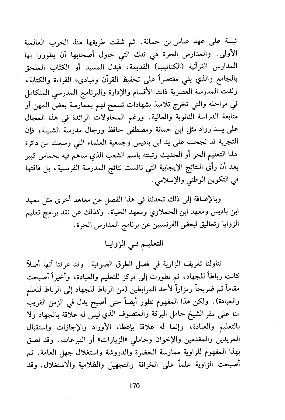 وبالإضافة إلى ذلك تحدثنا في هذا الفصل عن معاهد أخرى مثل معهد ابن باديس ومعهد ابن الحملاوي ومعهد الحياة. وكذلك عن نقد برامج تعليم الزوايا وتعاليق لبعض الفرنسيين عن برنامج المدارس الحرة.