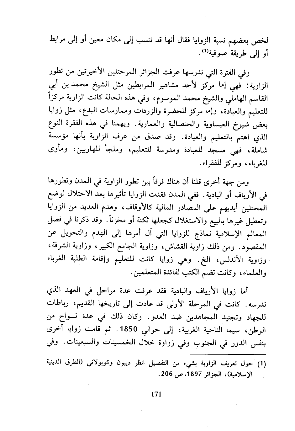 (¬1) حول تعريف الزاوية بشيء من التفصيل انظر ديبون وكوبولاني (الطرق الدينية الإسلامية)، الجزائر 1897، ص 206.