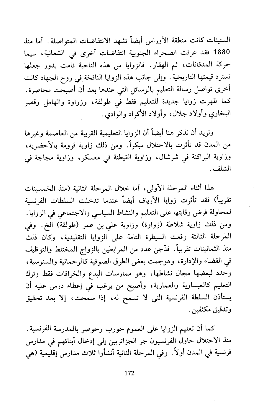 هذا أثناء المرحلة الأولى، أما خلال المرحلة الثانية (منذ الخمسينات تقريبا) فقد تأثرت زوايا الأرياف أيضا عندما تدخلت السلطات الفرنسية لمحاولة فرض رقابتها على التعليم والنشاط السياسي والاجتماعي في الزوايا. ومن ذلك زاوية شلاطة (زواوة) وزاوية علي بن عمر (طولقة) الخ. وفي المرحلة الثالثة وقعت السيطرة التامة على الزوايا التقليدية، وكان ذلك منذ الثمانينات تقريبا. فدجن عدد من المرابطين بالزواج المختلط والتوظيف في القضاء والإدارة، وهوجمت بعض الطرق الصوفية كالرحمانية والسنوسية، وحدد لبعضها مجال نشاطها، وهو ممارسات البدع والخرافات فقط وترك التعليم كالعيساوية والعمارية، وأصبح من يرغب في إعطاء درس عليه أن يستأذن السلطة الفرنسية التي لا تسمح له، إذا سمحت، إلا بعد تحقيق وتدقيق مكثفين.