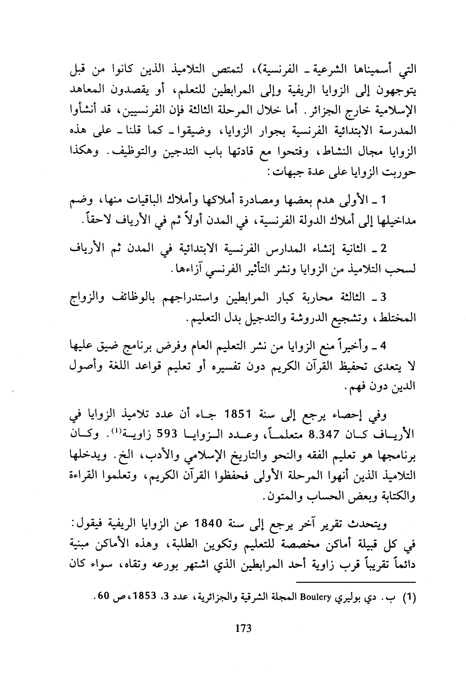 التي أسميناها الشرعية - الفرنسية)، لتمتص التلاميذ الذين كانوا من قبل يتوجهون إلى الزوايا الريفية وإلى المرابطين للتعلم، أو يقصدون المعاهد الإسلامية خارج الجزائر. أما خلال المرحلة الثالثة فإن الفرنسيين، قد أنشأوا المدرسة الابتدائية الفرنسية بجوار الزوايا، وضيقوا - كما قلنا - على هذه الزوايا مجال النشاط، وفتحوا مع قادتها باب التدجين والتوظيف. وهكذا حوربت الزوايا على عدة جبهات: