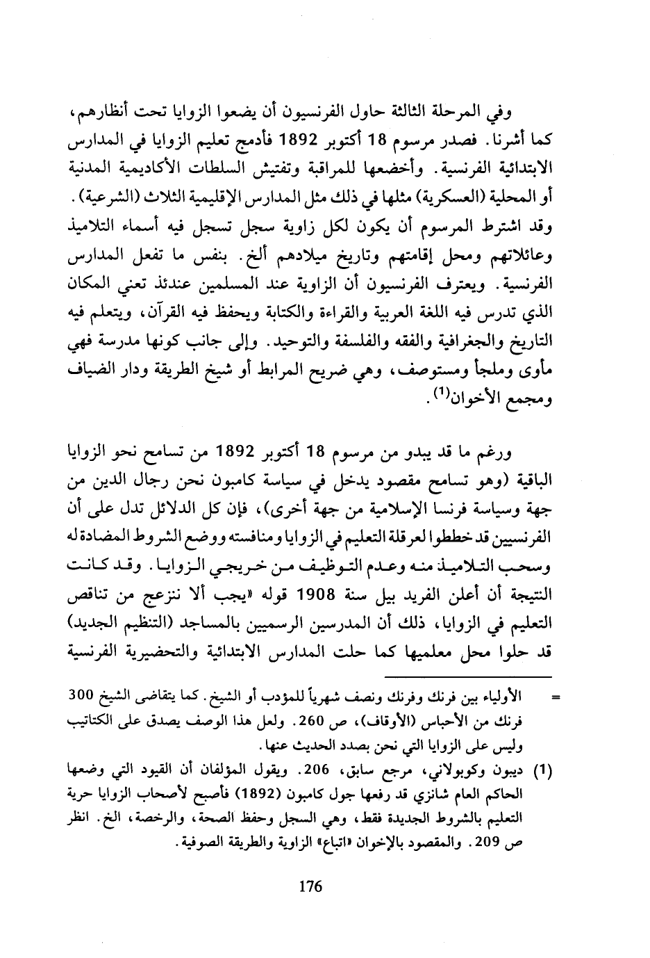(¬1) ديبون وكوبولاني، مرجع سابق، 206. ويقول المؤلفان أن القيود التي وضعها الحاكم العام شأنزي قد رفعها جول كامبون (1892) فاصبح لأصحاب الزوايا حرية التعليم بالشروط الجديدة فقط، وهي السجل وحفظ الصحة، والرخصة، الخ. انظر ص 209. والمقصود بالإخوان (اتباع) الزاوية والطريقة الصوفية.