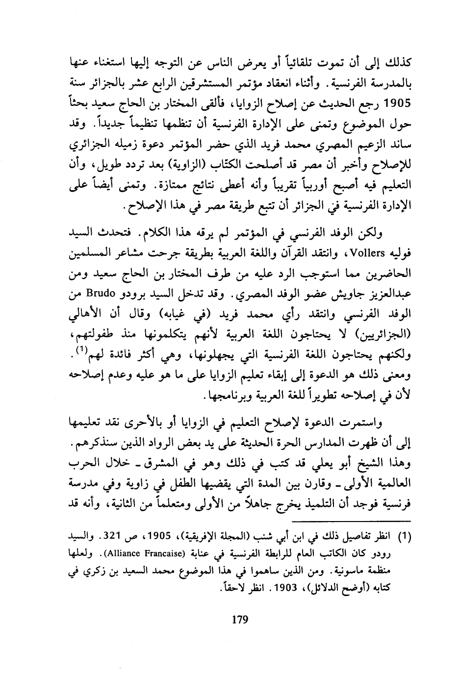 كذلك إلى أن تموت تلقائيا أو يعرض الناس عن التوجه إليها استغناء عنها بالمدرسة الفرنسية. وأثناء انعقاد مؤتمر المستشرقين الرابع عشر بالجزائر سنة 1905 رجع الحديث عن إصلاح الزوايا، فألقى المختار بن الحاج سعيد بحثا حول الموضوع وتمنى على الإدارة الفرنسية أن تنظمها تنظيما جديدا. وقد ساند الزعيم المصري محمد فريد الذي حضر المؤتمر دعوة زميله الجزائري للأصلاح وأخبر أن مصر قد أصلحت الكتاب (الزاوية) بعد تردد طويل، وأن التعليم فيه أصبح أوربيا تقريبا وأنه أعطى نتائج ممتازة. وتمنى أيضا على الإدارة الفرنسية في الجزائر أن تتبع طريقة مصر في هذا الإصلاح.