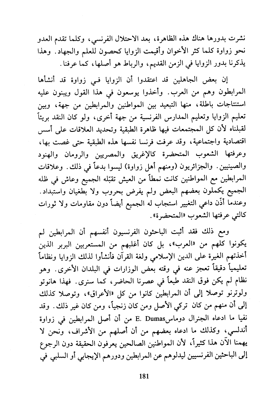 ومع ذلك فقد أثبت الباحثون الفرنسيون أنفسهم أن المرابطين لم يكونوا كلهم من (العرب)، بل كان أغلبهم من المستعربين البربر الذين أخذتهم الغيرة على الدين الإسلامي ولغة القرآن فانشأوا لذلك الزوايا ونظاما تعليميا دقيقا تعجز عنه في وقته بعض الوزارات في البلدان الأخرى. وهو نظام لم يكن فوق النقد طبعا في عصرنا الحاضر، كما سنرى. فهذا هانوتو ولوترنو توصلا إلى أن المرابطين كانوا من كل (الأعراق)، وتوصلا كذلك إلى أن منهم من كان تركي الأصل ومن كان زنجيا، ومن كان غير ذلك. وقد نفيا ما ادعاه الجنرال دوماس E.Dumas من أن أصل المرابطين في زواوة أندلسي، وكذلك ما ادعاه بعضهم من أن أصلهم من الأشراف، ونحن لا يهمنا الآن هذا كثيرا، لأن المواطنين الصالحين يعرفون الحقيقة دون الرجوع إلى الباحثين الفرنسيين ليدلوهم عن المرابطين ودورهم الإيجابي أو السلبي في