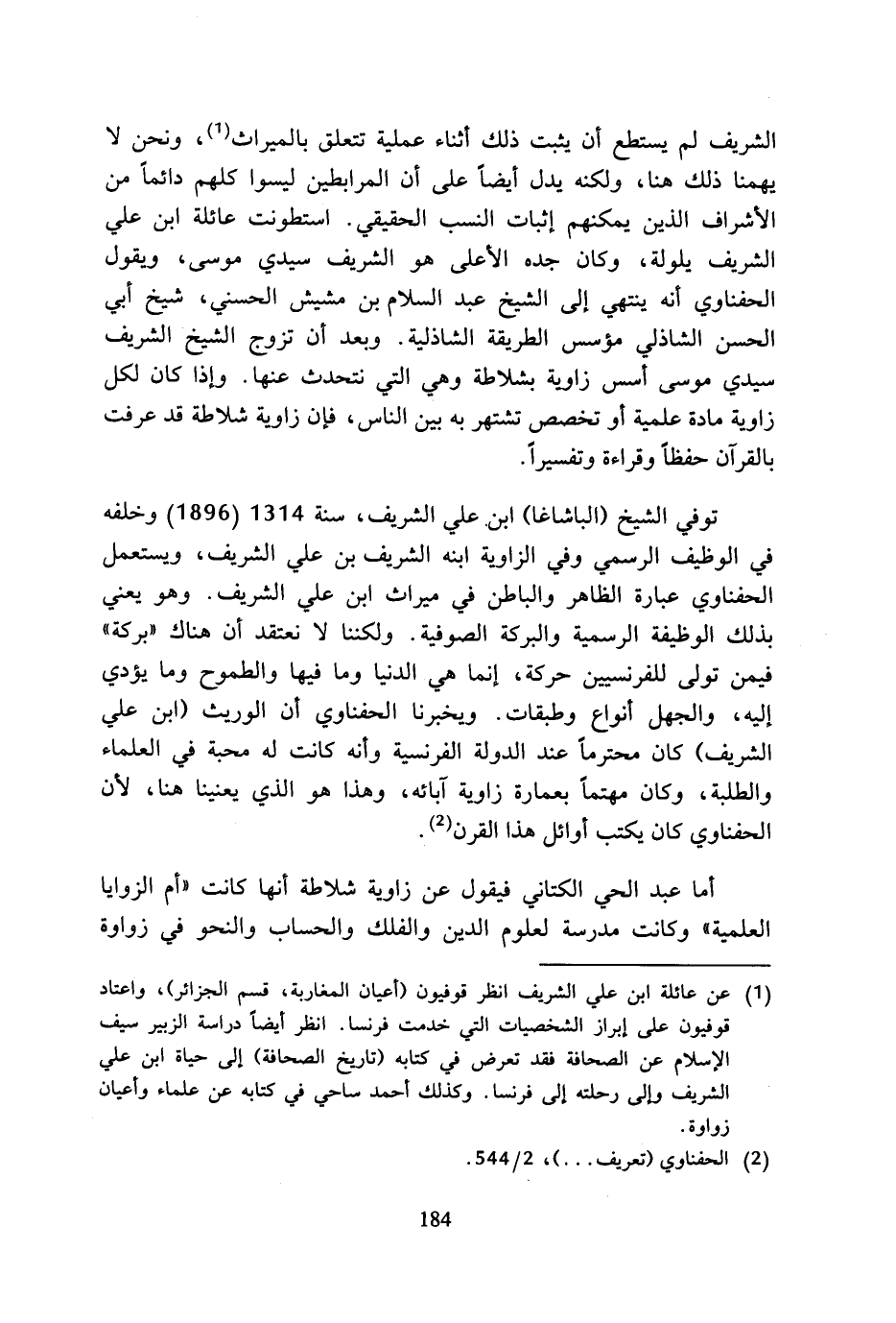 الشريف لم يستطع أن يثبت ذلك أثناء عملية تتعلق بالميراث (¬1)، ونحن لا يهمنا ذلك هنا، ولكنه يدل أيضا على أن المرابطين ليسوا كلهم دائما من الأشراف الذين يمكنهم إثبات النسب الحقيقي. استطونت عائلة ابن علي الشريف يلولة، وكان جده الأعلى هو الشريف سيدي موسى، ويقول الحفناوي أنه ينتهي إلى الشيخ عبد السلام بن مشيش الحسني، شيخ أبي الحسن الشاذلي مؤسس الطريقة الشاذلية. وبعد أن تزوج الشيخ الشريف سيدي موسى أسس زاوية بشلاطة وهي التي نتحدث عنها. وإذا كان لكل زاوية مادة علمية أو تخصص تشتهر به بين الناس، فإن زاوية شلاطة قد عرفت بالقرآن حفظا وقراءة وتفسيرا.