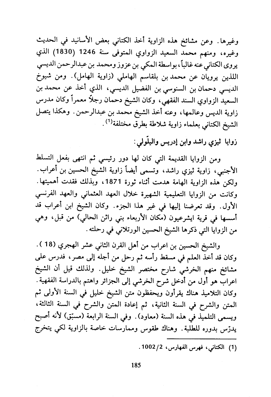 وغيرها. وعن مشائخ هذه الزاوية أخذ الكتاني بعض الأسانيد في الحديث وغيره، ومنهم محمد السعيد الزواوي المتوفى سنة 246 1 (1830) الذي يروى الكتاني عنه غالبا، بواسطة المكي بن عزوز ومحمد بن عبد الرحمن الديسي اللذين يرويان عن محمد بن بلقاسم الهاملي (زاوية الهامل). ومن شيوخ الديسي دحمان بن السنوسي بن الفضيل الديسي، الذي أخذ عن محمد بن السعيد الزواوي السند الفقهي، وكان الشيخ دحمان رجلا معمرا وكان مدرس زاوية الديس وعالمها، وعنه أخذ الشيخ محمد بن عبد الرحمن. وهكذا يتصل الشيخ الكتاني بعلماء زاوية شلاطة بطرق مختلفة (¬1).