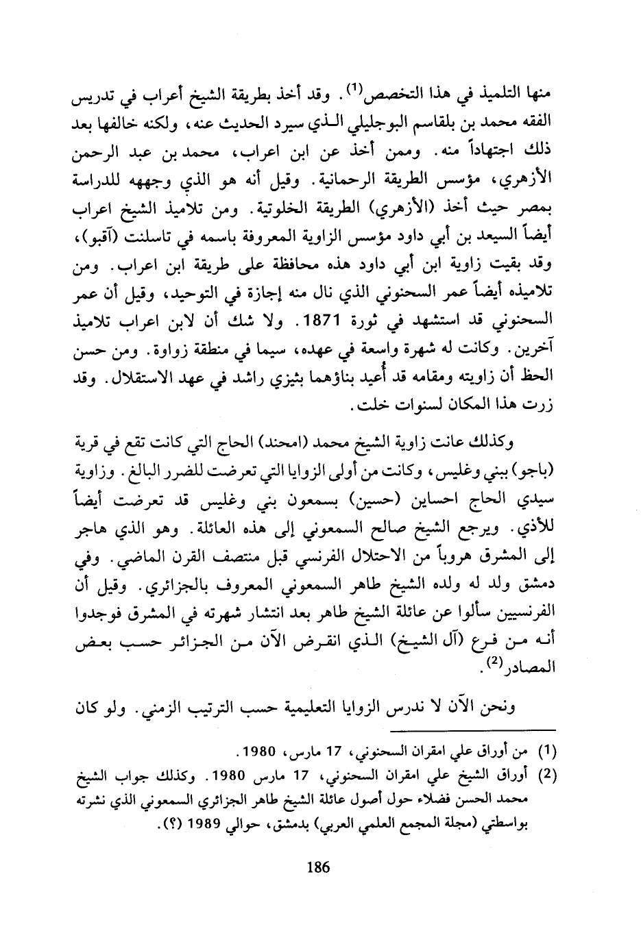 منها التلميذ في هذا التخصص (¬1). وقد أخذ بطريقة الشيخ أعراب في تدريس الفقه محمد بن بلقاسم البوجليلي الذي سيرد الحديث عنه، ولكنه خالفها بعد ذلك اجتهادا منه. وممن أخذ عن ابن اعراب، محمد بن عبد الرحمن الأزهري، مؤسس الطريقة الرحمانية. وقيل أنه هو الذي وجهه للدراسة بمصر حيث أخذ (الأزهري) الطريقة الخلوتية. ومن تلاميذ الشيخ اعراب أيضا السيعد بن أبي داود مؤسس الزاوية المعروفة باسمه في تاسلنت (آقبو)، وقد بقيت زاوية ابن أبي داود هذه محافظة على طريقة ابن اعراب. ومن تلاميذه أيضا عمر السحنوني الذي نال منه إجازة في التوحيد، وقيل أن عمر السحنوني قد استشهد في ثورة 1871. ولا شك أن لابن اعراب تلاميذ آخرين. وكانت له شهرة واسعة في عهده، سيما في منطقة زواوة. ومن حسن الحظ أن زاويته ومقامه قد أعيد بناؤهما بثيزي راشد في عهد الاستقلال. وقد زرت هذا المكان لسنوات خلت.