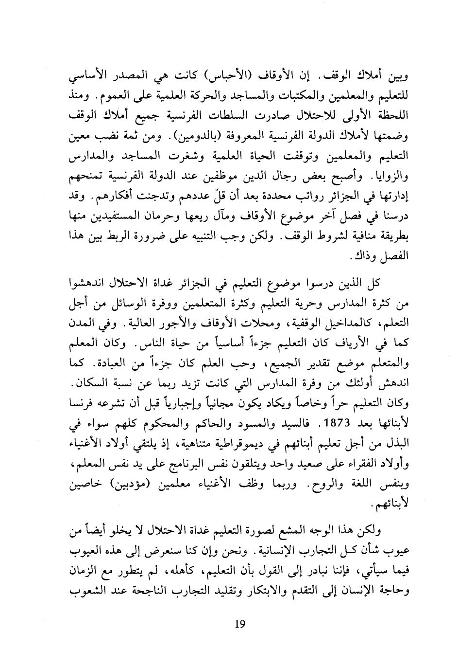 وبين أملاك الوقف. إن الأوقاف (الأحباس) كانت هي المصدر الأساسي للتعليم والمعلمين والمكتبات والمساجد والحركة العلمية على العموم. ومنذ اللحظة الأولى للاحتلال صادرت السلطات الفرنسية جميع أملاك الوقف وضمتها لأملاك الدولة الفرنسية المعروفة (بالدومين). ومن ثمة نضب معين التعليم والمعلمين وتوقفت الحياة العلمية وشغرت المساجد والمدارس والزوايا. وأصبح بعض رجال الدين موظفين عند الدولة الفرنسية تمنحهم إدارتها في الجزائر رواتب محددة بعد أن قل عددهم وتدجنت أفكارهم. وقد درسنا في فصل آخر موضوع الأوقاف ومال ريعها وحرمان المستفيدين منها بطريقة منافية لشروط الوقف. ولكن وجب التنبيه على ضرورة الربط بين هذا الفصل وذاك.