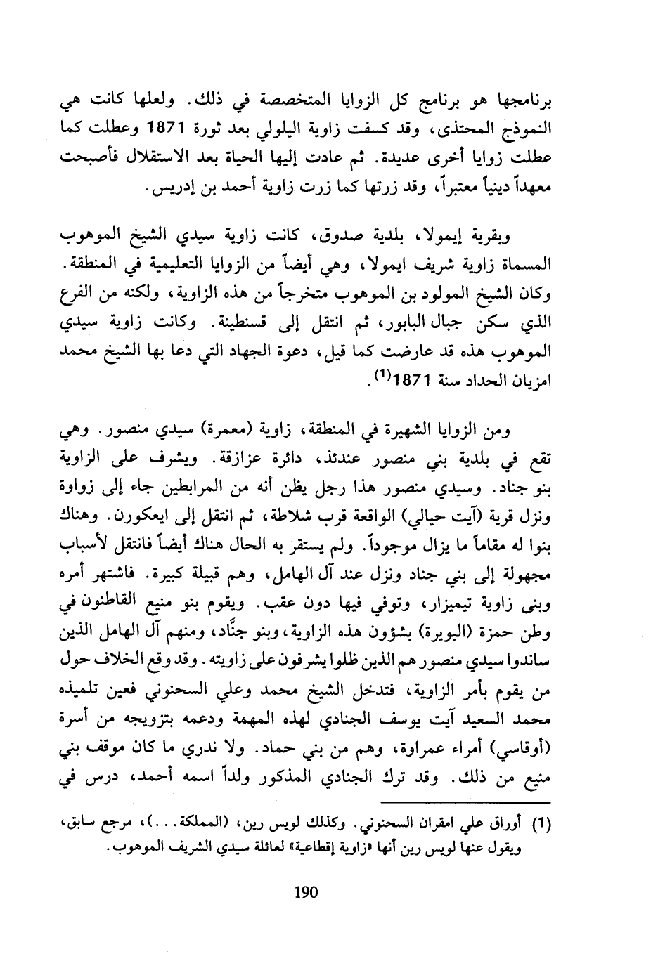 (¬1) أوراق علي امقران السحنوني. وكذلك لويس رين، (المملكة ...)، مرجع سابق، ويقول عنها لويس رين أنها (زاوية إقطاعي) لعائلة سيدي الشريف الموهوب.