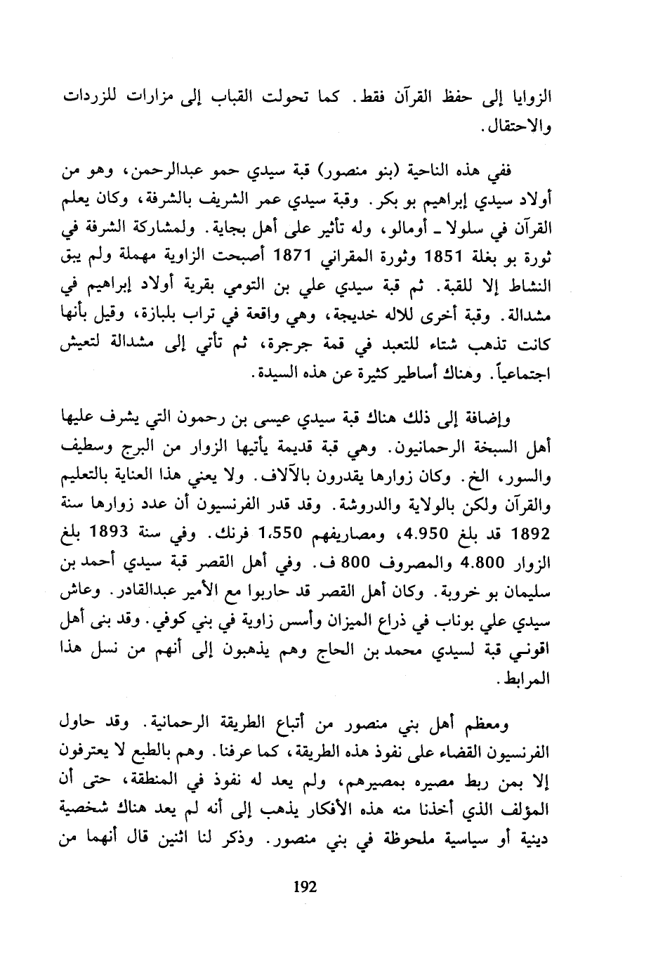 وإضافة إلى ذلك هناك قبة سيدي عيسى بن رحمون التي يشرف عليها أهل السبخة الرحمانيون. وهي قبة قديمة يأتيها الزوار من البرج وسطيف والسور، الخ. وكان زوارها يقدرون بالآلاف. ولا يعني هذا العناية بالتعليم والقرآن ولكن بالولاية والدروشة. وقد قدر الفرنسيون أن عدد زوارها سنة 1892 قد بلغ 4.950، ومصاريفهم 50 ك! أفرنك. وفي سنة 1893 بلغ الزوار 4.800 والمصروف 800 ف. وفي أهل القصر قبة سيدي أحمد بن سليمان بو خروبة. وكان أهل القصر قد حاربوا مع الأمير عبد القادر. وعاش سيدي علي بوناب في ذراع الميزان وأسس زاوية في بني كوفي. وقد بنى أهل اقوني قبة لسيدي محمد بن الحاج وهم يذهبون إلى أنهم من نسل هذا المرابط.