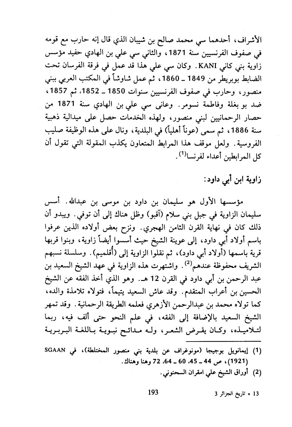 الأشراف، أحدهما سي محمد صالح بن شيبان الذي قال إنه حارب مع قومه في صفوف الفرنسيين سنة 1871، والثاني سي علي بن الهادي حفيد مؤسس زاوية بني كاني KANI. وكان سي علي هذا قد عمل في فرقة الفرسان تحت الضابط بوبريطر من 1849 - 1860، ثم عمل شاوشا في المكتب العربي ببني منصور، وحارب في صفوف الفرنسيين سنوات 1850 - 1852، ثم 1857، ضد بو بغلة وفاطمة نسومر. وعانى سي علي بن الهادي سنة 1871 من حصار الرحمانيين لبني منصور، ولهذه الخدمات حصل على ميدالية ذهبية سنة 1886، ثم سمى (عونا أهليا) في البلدية، ونال على هذه الوظيفة صليب الفروسية. ولعل موقف هذا المرابط المتعاون يكذب المقولة التي تقول أن كل المرابطين أعداء لفرنسا (¬1).