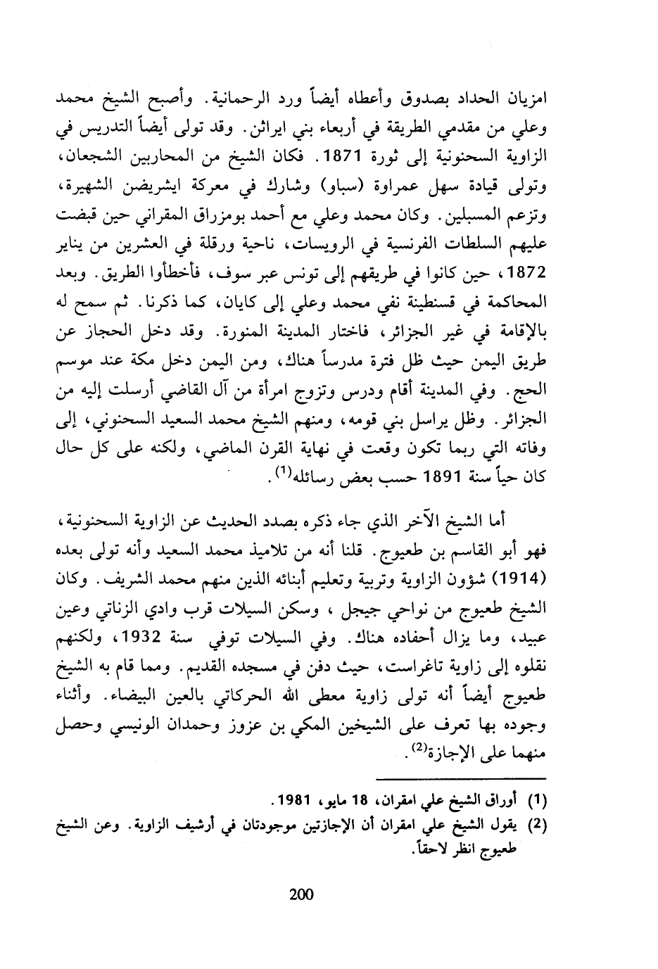 امزيان الحداد بصدوق وأعطاه أيضا ورد الرحمانية. وأصبح الشيخ محمد وعلي من مقدمي الطريقة في أربعاء بني ايراثن. وقد تولى أيضا التدريس في الزاوية السحنونية إلى ثورة 1871. فكان الشيخ من المحاربين الشجعان، وتولى قيادة سهل عمراوة (سباو) وشارك في معركة ايشريضن الشهيرة، وتزعم المسبلين. وكان محمد وعلي مع أحمد بومزراق المقراني حين قبضت عليهم السلطات الفرنسية في الرويسات، ناحية ورقلة في العشرين من يناير 1872، حين كانوا في طريقهم إلى تونس عبر سوف، فأخطأوا الطريق. وبعد المحاكمة في قسنطينة نفي محمد وعلي إلى كايان، كما ذكرنا. ثم سمح له بالإقامة في غير الجزائر، فاختار المدينة المنورة. وقد دخل الحجاز عن طريق اليمن حيث ظل فترة مدرسا هناك، ومن اليمن دخل مكة عند موسم الحج. وفي المدينة أقام ودرس وتزوج امرأة من آل القاضي أرسلت إليه من الجزائر. وظل يراسل بني قومه، ومنهم الشيخ محمد السعيد السحنوني، إلى وفاته التي ربما تكون وقعت في نهاية القرن الماضي، ولكنه على كل حال كان حيا سنة 1891 حسب بعض رسائله (¬1).