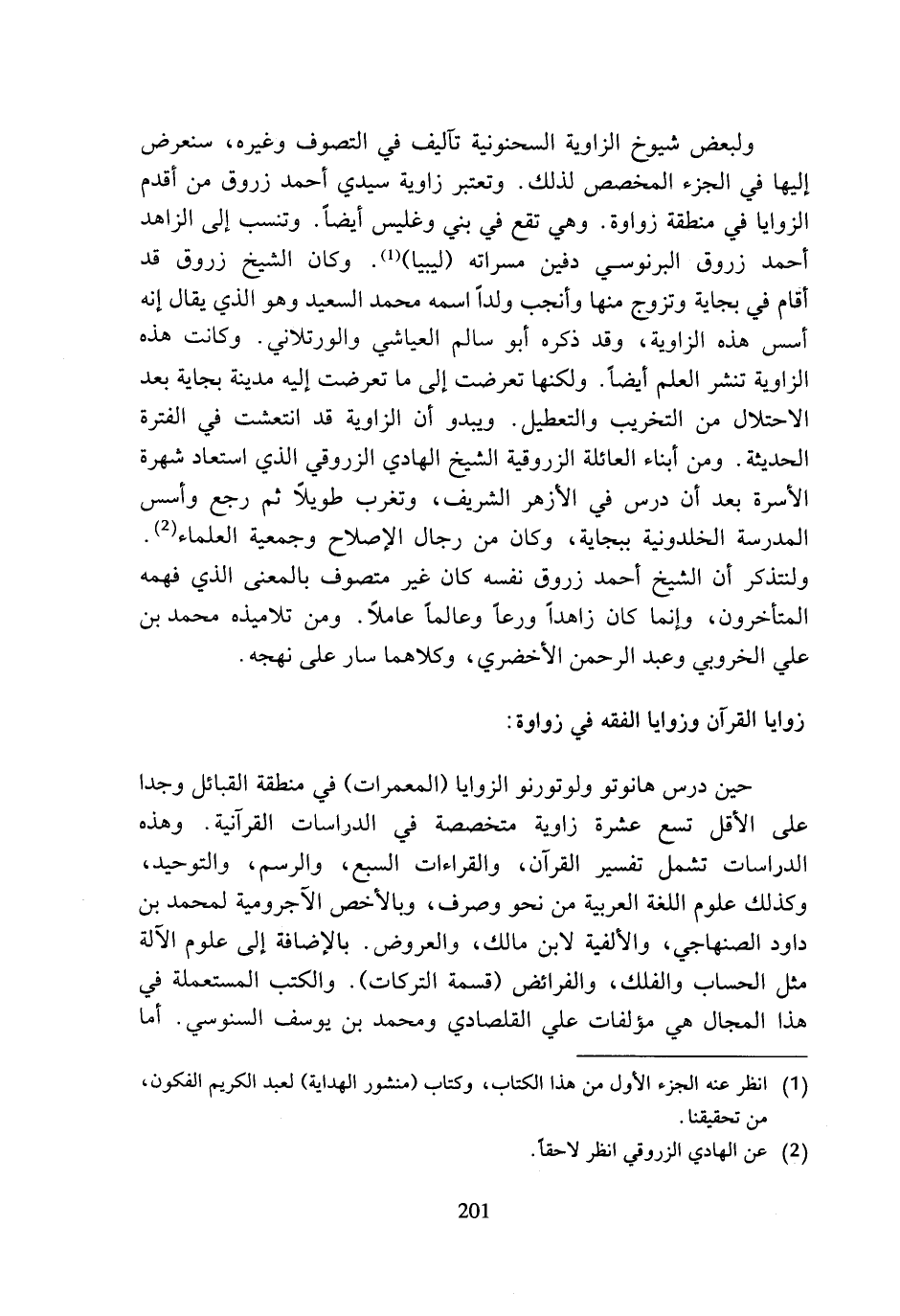 ولبعض شيوخ الزاوية السحنونية تآليف في التصوف وغيره، سنعرض إليها في الجزء المخصص لذلك. وتعتبر زاوية سيدي أحمد زروق من أقدم الزوايا في منطقة زواوة. وهي تقع في بني وغليس أيضا. وتنسب إلى الزاهد أحمد زروق البرنوسي دفين مسراته (ليبيا) (¬1). وكان الشيخ زروق قد أقام في بجاية وتزوج منها وأنجب ولدا اسمه محمد السعيد وهو الذي يقال إنه أسس هذه الزاوية، وقد ذكره أبو سالم العياشي والورتلاني. وكانت هذه الزاوية تنشر العلم أيضا. ولكنها تعرضت إلى ما تعرضت إليه مدينة بجاية بعد الاحتلال من التخريب والتعطيل. ويبدو أن الزاوية قد انتعشت في الفترة الحديثة. ومن أبناء العائلة الزروقية الشيخ الهادي الزروقي الذي استعاد شهرة الأسرة بعد أن درس في الأزهر الشريف، وتغرب طويلا ثم رجع وأسس المدرسة الخلدونية ببجاية، وكان من رجال الإصلاح وجمعية العلماء (¬2). ولنتذكر أن الشيخ أحمد زروق نفسه كان غير متصوف بالمعنى الذي فهمه المتأخرون، وإنما كان زاهدا ورعا وعالما عاملا. ومن تلاميذه محمد بن علي الخروبي وعبد الرحمن الأخضري، وكلاهما سار على نهجه.