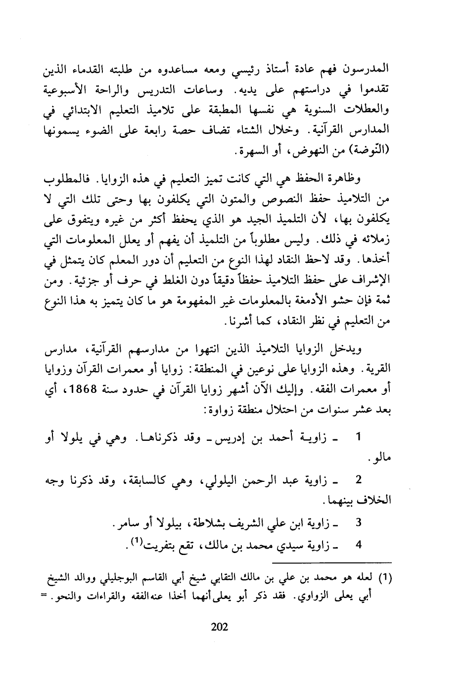 ويدخل الزوايا التلاميذ الذين انتهوا من مدارسهم القرآنية، مدارس القرية. وهذه الزوايا على نوعين في المنطقة: زوايا أو معمرات القرآن وزوايا أو معمرات الفقه. وإليك الآن أشهر زوايا القرآن في حدود سنة 1868، أي بعد عشر سنوات من احتلال منطقة زواوة: