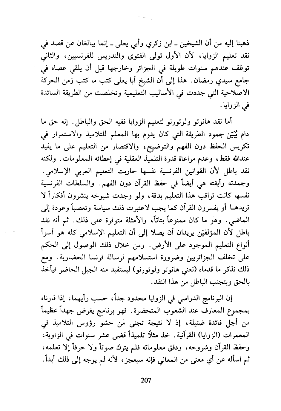 أما نقد هانوتو ولوتورنو لتعليم الزوايا ففيه الحق والباطل. إنه حق ما دام يبين جمود الطريقة التي كان يقوم بها المعلم للتلاميذ والاستمرار في تكريس الحفظ دون الفهم والتوضيح، والاقتصار من التعليم على ما يفيد عند الله فقط، وعدم مراعاة قدرة التلميذ العقلية في إعطائه المعلومات. ولكنه نقد باطل لأن القوانين الفرنسية نفسها حاربت التعليم العربي الإسلامي. وجمدته وأبقته هي أيضا في حفظ القرآن دون الفهم. والسلطات الفرنسية نفسها كانت تراقب هذا التعليم بدقة، ولو وجدت شيوخه ينشرون أفكارا لا تريدها أو يفسرون القرآن كما يجب لاعتبرت ذلك سياسة وتعصبا وعودة إلى الماضي. وهو ما كان ممنوعا بتاتا، والأمثلة متوفرة على ذلك. ثم أنه نقد باطل لأن المؤلفين يريدان أن يصلا إلى أن التعليم الإسلامي كله هو أسوأ أنواع التعليم الموجود على الأرض. ومن خلال ذلك الوصول إلى الحكم على تخلف الجزائريين وضرورة استسلامهم لرسالة فرنسا الحضارية. ومع ذلك نذكر ما قدماه (نعني هانوتو ولوتورنو) ليستفيد منه الجيل الحاضر فيأخذ بالحق ويتجنب الباطل من هذا النقد.