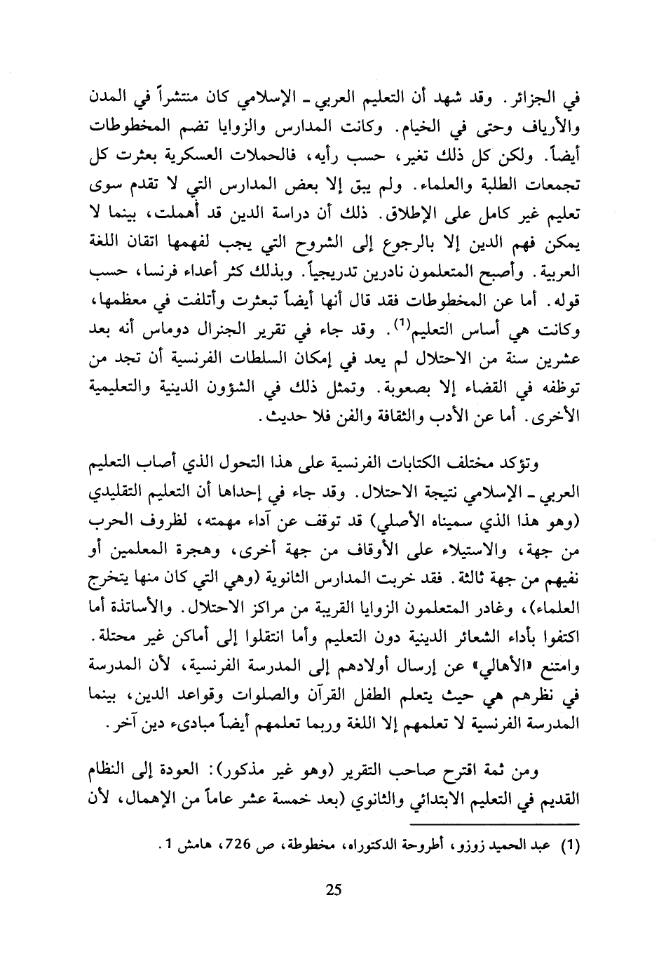 في الجزائر. وقد شهد أن التعليم العربي - الإسلامي كان منتشرا في المدن والأرياف وحتى في الخيام. وكانت المدارس والزوايا تضم المخطوطات أيضا. ولكن كل ذلك تغير، حسب رأيه، فالحملات العسكرية بعثرت كل تجمعات الطلبة والعلماء. ولم يبق إلا بعض المدارس التي لا تقدم سوى تعليم غير كامل على الإطلاق. ذلك أن دراسة الدين قد أهملت، بينما لا يمكن فهم الدين إلا بالرجوع إلى الشروح التي يجب لفهمها إتقان اللغة العربية. وأصبح المتعلمون نادرين تدريجيا. وبذلك كثر أعداء فرنسا، حسب قوله. أما عن المخطوطات فقد قال أنها أيضا تبعثرت وأتلفت في معظمها، وكانت هي أساس التعليم (¬1). وقد جاء في تقرير الجنرال دوماس أنه بعد عشرين سنة من الاحتلال لم يعد في إمكان السلطات الفرنسية أن تجد من توظفه في القضاء إلا بصعوبة. وتمثل ذلك في الشؤون الدينية والتعليمية الأخرى. أما عن الأدب والثقافة والفن فلا حديث.