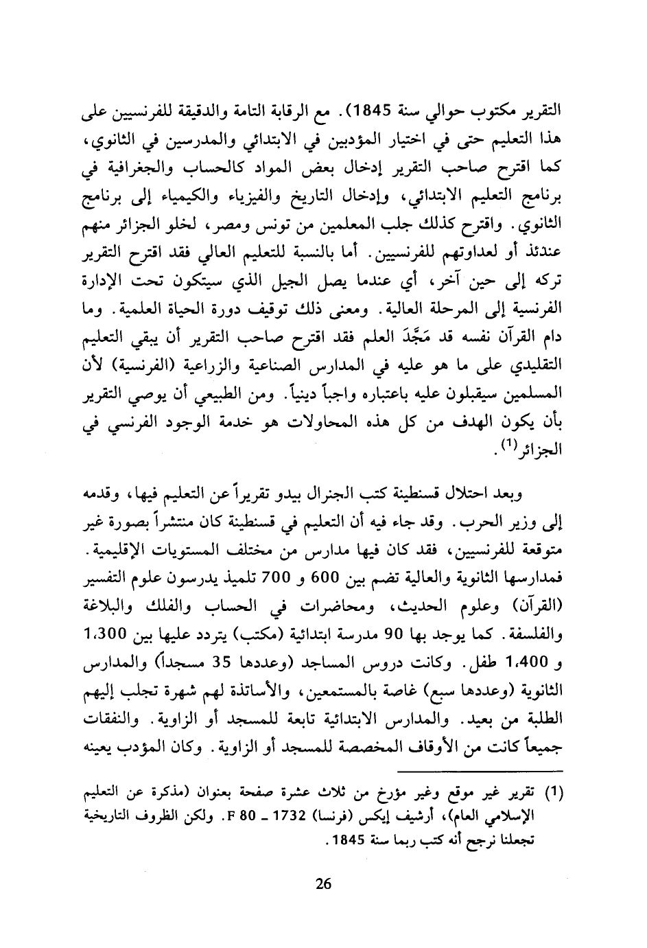 التقرير مكتوب حوالي سنة 1845). مع الرقابة التامة والدقيقة للفرنسيين على هذا التعليم حتى في اختيار المؤدبين في الابتدائي والمدرسين في الثانوي، كما اقترح صاحب التقرير إدخال بعض المواد كالحساب والجغرافية في برنامج التعليم الابتدائي، وإدخال التاريخ والفيزياء والكيمياء إلى برنامج الثانوي. واقترح كذلك جلب المعلمين من تونس ومصر، لخلو الجزائر منهم عندئذ أو لعداوتهم للفرنسيين. أما بالنسبة للتعليم العالي فقد اقترح التقرير تركه إلى حين آخر، أي عندما يصل الجيل الذي سيتكون تحت الإدارة الفرنسية إلى المرحلة العالية. ومعنى ذلك توقيف دورة الحياة العلمية. وما دام القرآن نفسه قد مجد العلم فقد اقترح صاحب التقرير أن يبقي التعليم التقليدي على ما هو عليه في المدارس الصناعية والزراعية (الفرنسية) لأن المسلمين سيقبلون عليه باعتباره واجبا دينيا. ومن الطبيعي أن يوصي التقرير بأن يكون الهدف من كل هذه المحاولات هو خدمة الوجود الفرنسي في الجزائر (¬1).