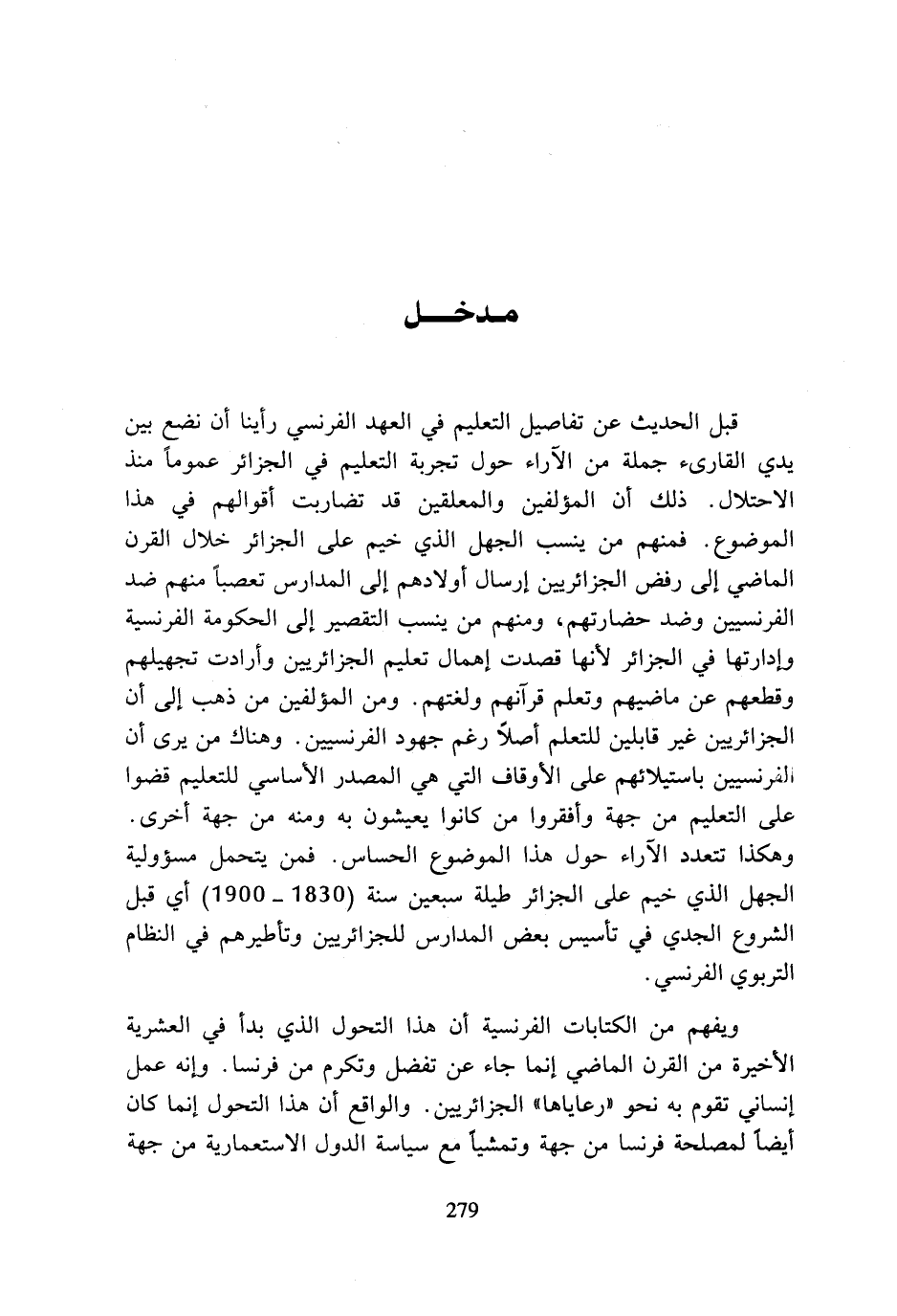 قبل الحديث عن تفاصيل التعليم في العهد الفرنسي رأينا أن نضع بين يدي القارئ جملة من الآراء حول تجربة التعليم في الجزائر عموما منذ الاحتلال. ذلك أن المؤلفين والمعلقين قد تضاربت أقوالهم في هذا الموضوع. فمنهم من ينسب الجهل الذي خيم على الجزائر خلال القرن الماضي إلى رفض الجزائريين إرسال أولادهم إلى المدارس تعصبا منهم ضد الفرنسيين وضد حضارتهم، ومنهم من ينسب التقصير إلى الحكومة الفرنسية وإدارتها في الجزائر لأنها قصدت إهمال تعليم الجزائريين وأرادت تجهيلهم وقطعهم عن ماضيهم وتعلم قرآنهم ولغتهم. ومن المؤلفين من ذهب إلى أن الجزائريين غير قابلين للتعلم أصلا رغم جهود الفرنسيين. وهناك من يرى أن الفرنسيين باستيلائهم على الأوقاف التي هي المصدر الأساسي للتعليم قضوا على التعليم من جهة وأفقروا من كانوا يعيشون به ومنه من جهة أخرى. وهكذا تتعدد الآراء حول هذا الموضوع الحساس. فمن يتحمل مسؤولية الجهل الذي خيم على الجزائر طيلة سبعين سنة (1830 - 1955) أي قبل الشروع الجدي في تأسيس بعض المدارس للجزائريين وتأطيرهم في النظام التربوي الفرنسي.