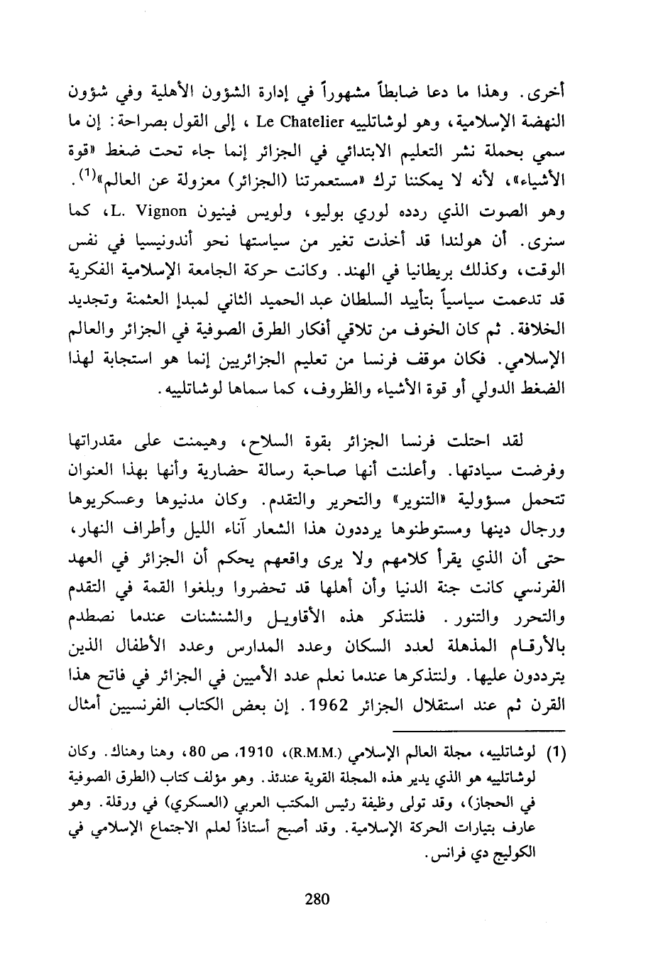(¬1) لوشاتلييه، مجلة العالم الإسلامي (R.M.M)، 1910، ص 80، وهنا وهناك. وكان لوشاتلييه هو الذي يدير هذه المجلة القوية عندئذ. وهو مؤلف كتاب (الطرق الصوفية في الحجاز)، وقد تولى وظيفة رئيس المكتب العربي (العسكري) في ورقلة. وهو عارف بتيارات الحركة الإسلامية. وقد أصبح أستاذا لعلم الاجتماع الإسلامي في الكوليج دي فرانس.