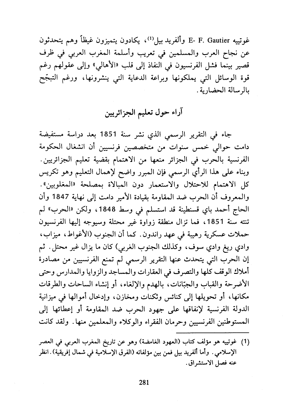 (¬1) غوتييه هو مؤلف كتاب (العهود الغامضة) وهو عن تاريخ المغرب العربي في العصر الإسلامي. وأما ألفريد بيل فمن بين مؤلفاته (الفرق الإسلامية في شمال إفريقية). انظر عنه فصل الاستشراق.