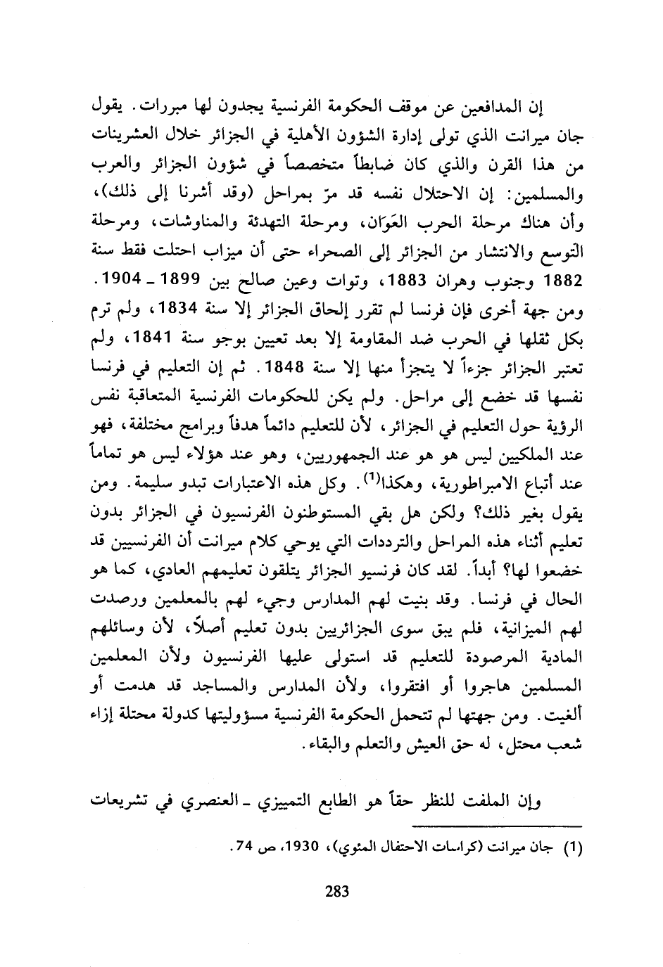 إن المدافعين عن موقف الحكومة الفرنسية يجدون لها مبررات. يقول جان ميرانت الذي تولى إدارة الشؤون الأهلية في الجزائر خلال العشرينات من هذا القرن والذي كان ضابطا متخصصا في شؤون الجزائر والعرب والمسلمين: إن الاحتلال نفسه قد مر بمراحل (وقد أشرنا إلى ذلك)، وأن هناك مرحلة الحرب العوان، ومرحلة التهدئة والمناوشات، ومرحلة التوسع والانتشار من الجزائر إلى الصحراء حتى أن ميزاب احتلت فقط سنة 1882 وجنوب وهران 1883، وتوات وعين صالح بين 1899 - 1904. ومن جهة أخرى فإن فرنسا لم تقرر إلحاق الجزائر إلا سنة 1834، ولم ترم بكل ثقلها في الحرب ضد المقاومة إلا بعد تعيين بوجو سنة 1841، ولم تعتبر الجزائر جزءا لا يتجزأ منها إلا سنة 1848. ثم إن التعليم في فرنسا نفسها قد خضع إلى مراحل. ولم يكن للحكومات الفرنسية المتعاقبة نفس الرؤية حول التعليم في الجزائر، لأن للتعليم دائما هدفا وبرامج مختلفة، فهو عند الملكيين ليس هو هو عند الجمهوريين، وهو عند هؤلاء ليس هو تماما عند أتباع الامبراطورية، وهكذا (¬1). وكل هذه الاعتبارات تبدو سليمة. ومن يقول بغير ذلك؟ ولكن هل بقي المستوطنون الفرنسيون في الجزائر بدون تعليم أثناء هذه المراحل والترددات التي يوحي كلام ميرانت أن الفرنسيين قد خضعوا لها؟ أبدا. لقد كان فرنسيو الجزائر يتلقون تعليمهم العادي، كما هو الحال في فرنسا. وقد بنيت لهم المدارس وجيء لهم بالمعلمين ورصدت لهم الميزانية، فلم يبق سوى الجزائريين بدون تعليم أصلا، لأن وسائلهم المادية المرصودة للتعليم قد استولى عليها الفرنسيون ولأن المعلمين المسلمين هاجروا أو افتقروا، ولأن المدارس والمساجد قد هدمت أو ألغيت. ومن جهتها لم تتحمل الحكومة الفرنسية مسؤوليتها كدولة محتلة إزاء شعب محتل، له حق العيش والتعلم والبقاء.